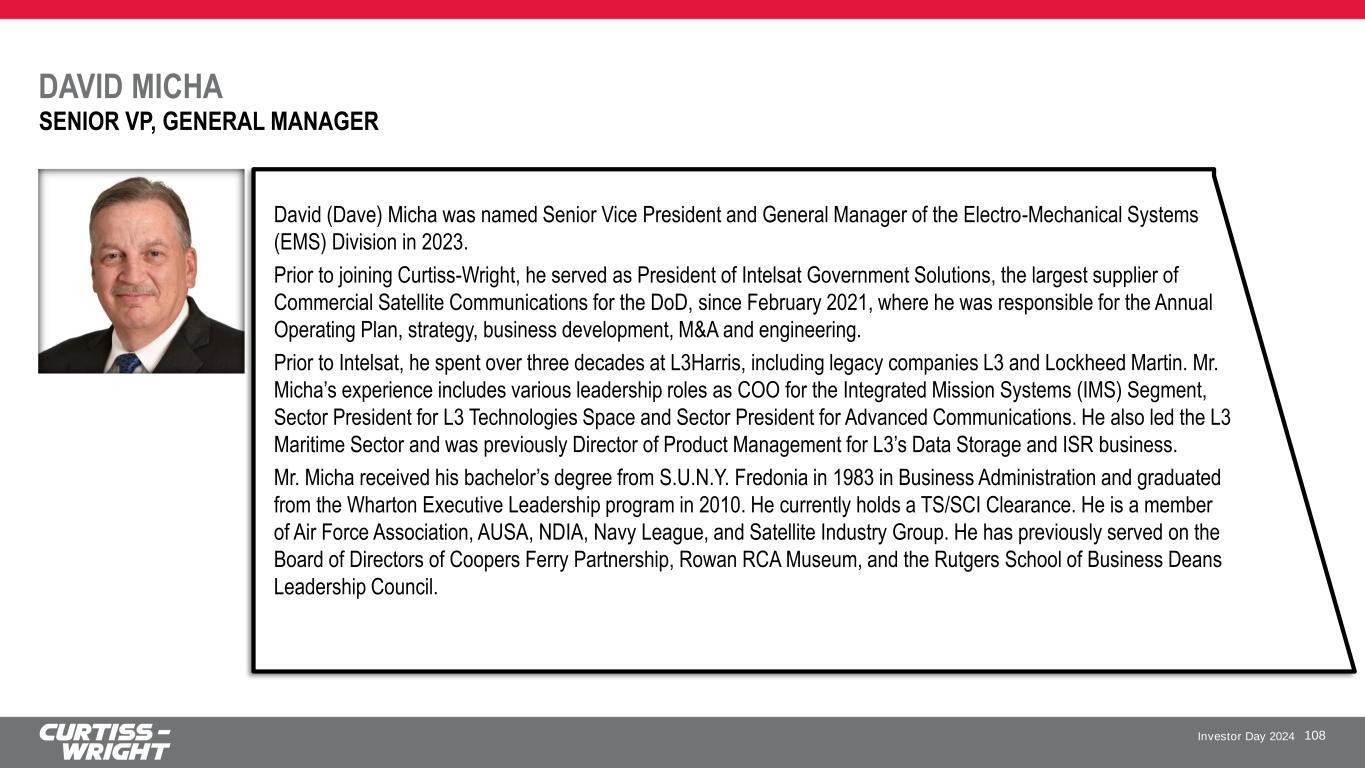 Investor Day 2024 DAVID MICHA 108 SENIOR VP, GENERAL MANAGER David (Dave) Micha was named Senior Vice President and General Manager of the Electro-Mechanical Systems (EMS) Division in 2023. Prior to joining Curtiss-Wright, he served as President of Intelsat Government Solutions, the largest supplier of Commercial Satellite Communications for the DoD, since February 2021, where he was responsible for the Annual Operating Plan, strategy, business development, M&A and engineering. Prior to Intelsat, he spent over three decades at L3Harris, including legacy companies L3 and Lockheed Martin. Mr. Micha’s experience includes various leadership roles as COO for the Integrated Mission Systems (IMS) Segment, Sector President for L3 Technologies Space and Sector President for Advanced Communications. He also led the L3 Maritime Sector and was previously Director of Product Management for L3’s Data Storage and ISR business. Mr. Micha received his bachelor’s degree from S.U.N.Y. Fredonia in 1983 in Business Administration and graduated from the Wharton Executive Leadership program in 2010. He currently holds a TS/SCI Clearance. He is a member of Air Force Association, AUSA, NDIA, Navy League, and Satellite Industry Group. He has previously served on the Board of Directors of Coopers Ferry Partnership, Rowan RCA Museum, and the Rutgers School of Business Deans Leadership Council.