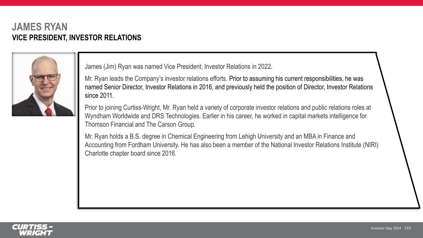 Investor Day 2024 JAMES RYAN 110 VICE PRESIDENT, INVESTOR RELATIONS James (Jim) Ryan was named Vice President, Investor Relations in 2022. Mr. Ryan leads the Company’s investor relations efforts. Prior to assuming his current responsibilities, he was named Senior Director, Investor Relations in 2016, and previously held the position of Director, Investor Relations since 2011. Prior to joining Curtiss-Wright, Mr. Ryan held a variety of corporate investor relations and public relations roles at Wyndham Worldwide and DRS Technologies. Earlier in his career, he worked in capital markets intelligence for Thomson Financial and The Carson Group. Mr. Ryan holds a B.S. degree in Chemical Engineering from Lehigh University and an MBA in Finance and Accounting from Fordham University. He has also been a member of the National Investor Relations Institute (NIRI) Charlotte chapter board since 2016.