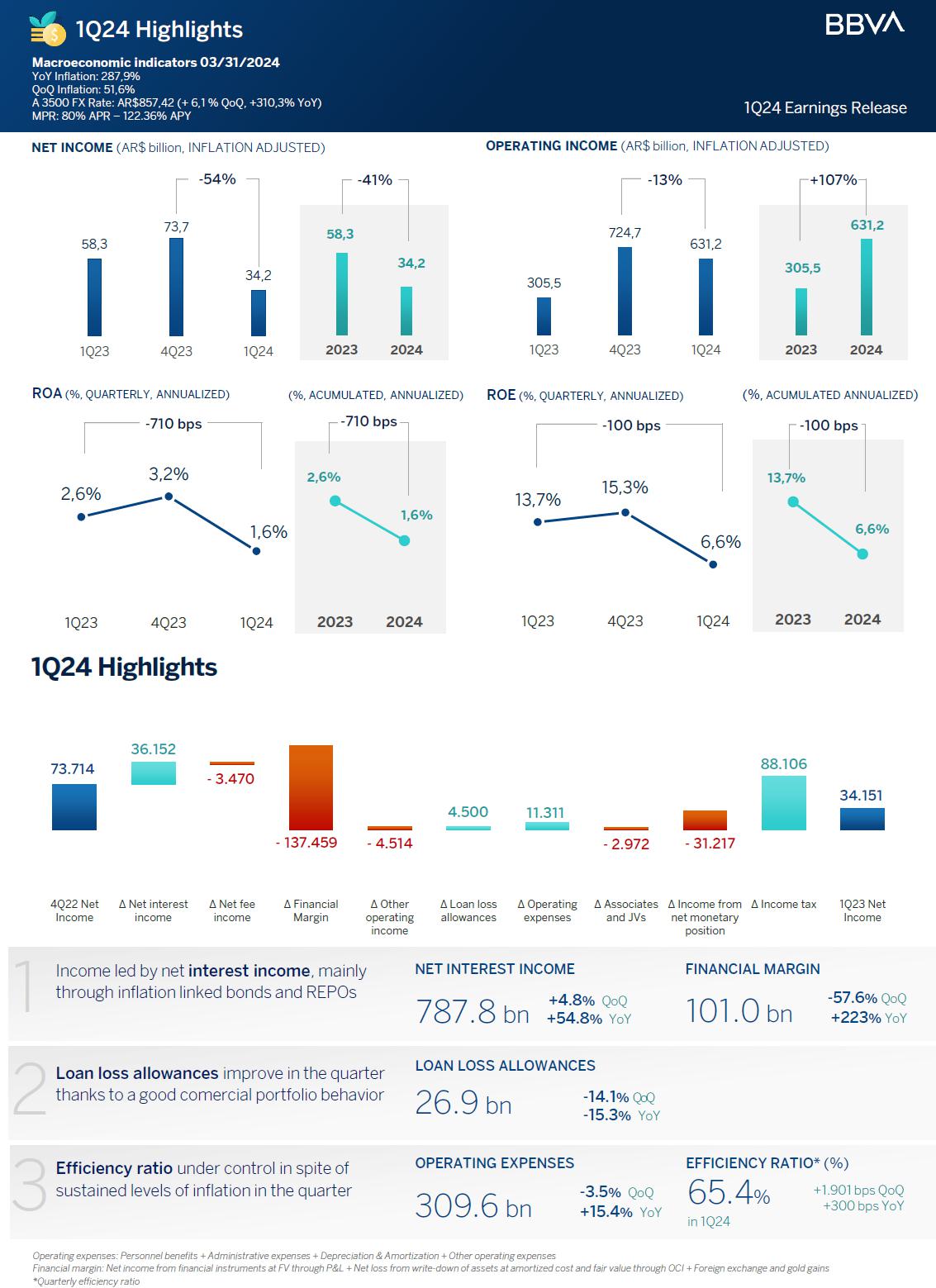 | · | BBVA Argentina’s inflation adjusted net income in 1Q24 was $34.2 billion, 53.7% lower than the $73.7 billion reported on the fourth quarter of 2023 (4Q23), and 41.4% lower than the $58.3 billion reported on the first quarter of 2023 (1Q23). |