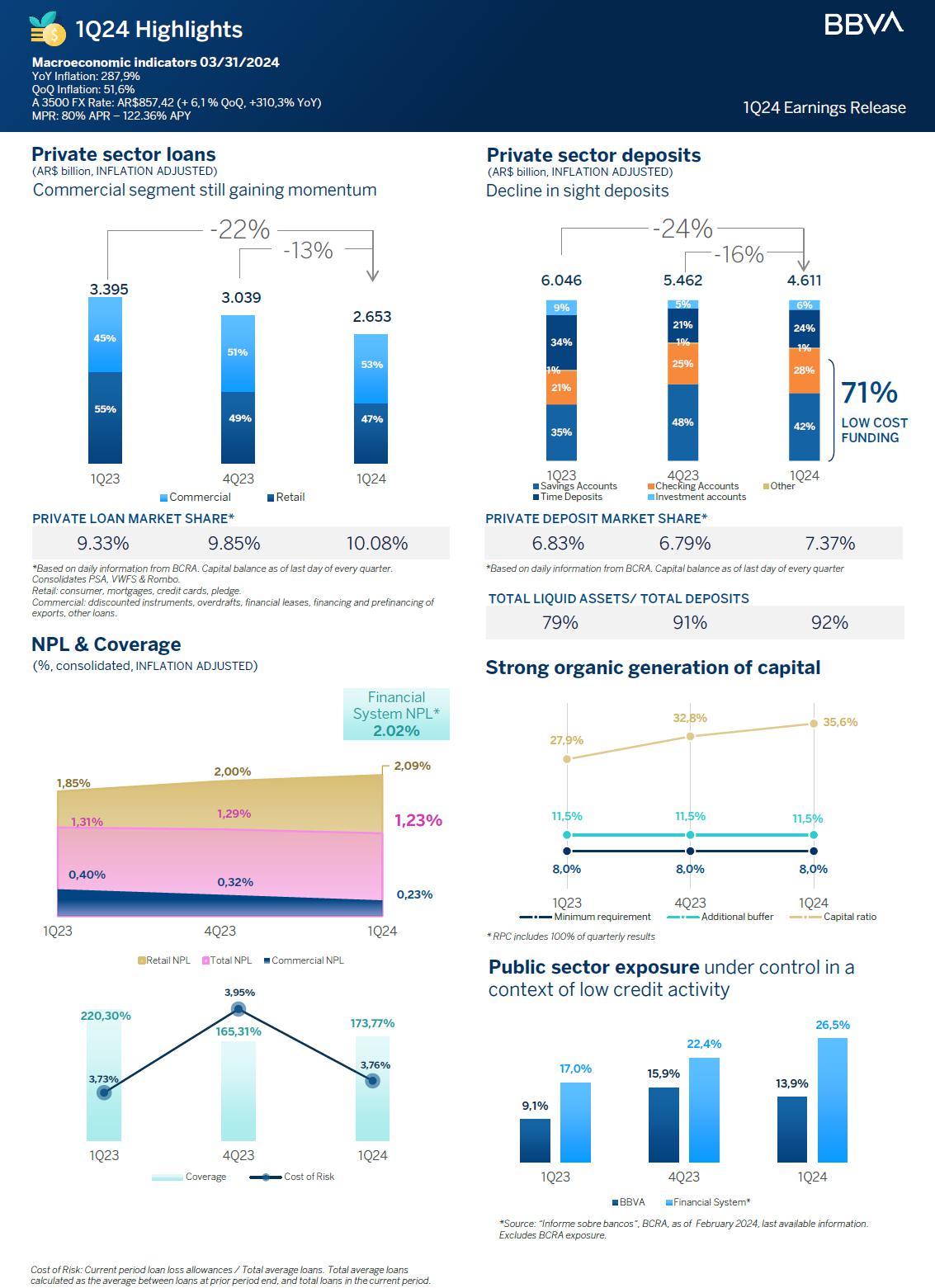 On the other hand, as of March 2024, BBVA Argentina reached a private deposit NPL of 1.23%, way below the 2.00% ratio of the System, last available indicator as of February 2024. Concerning liquidity and solvency indicators, the Bank ends the quarter with 91.9% and 35.6% respectively, levels which undoubtedly allow to address business growth in the case of an economic recovery.