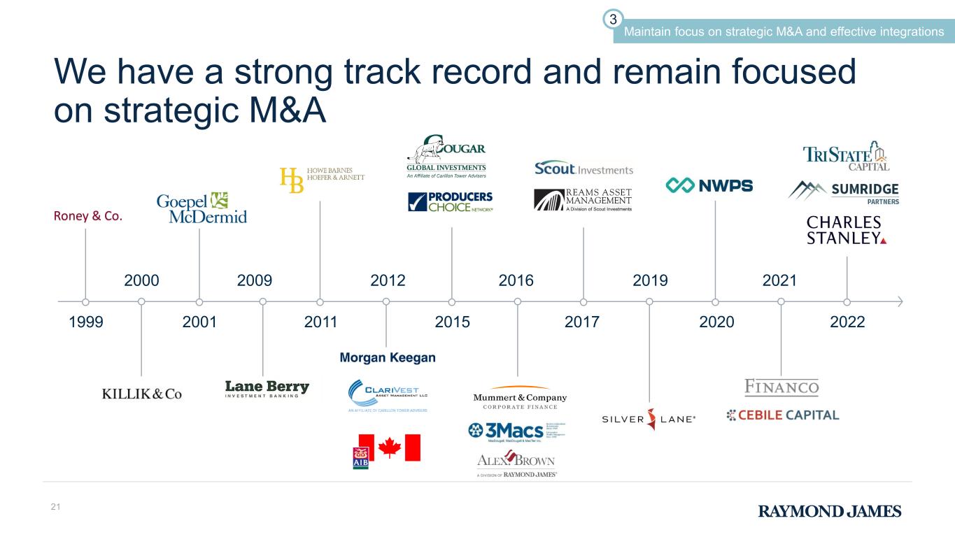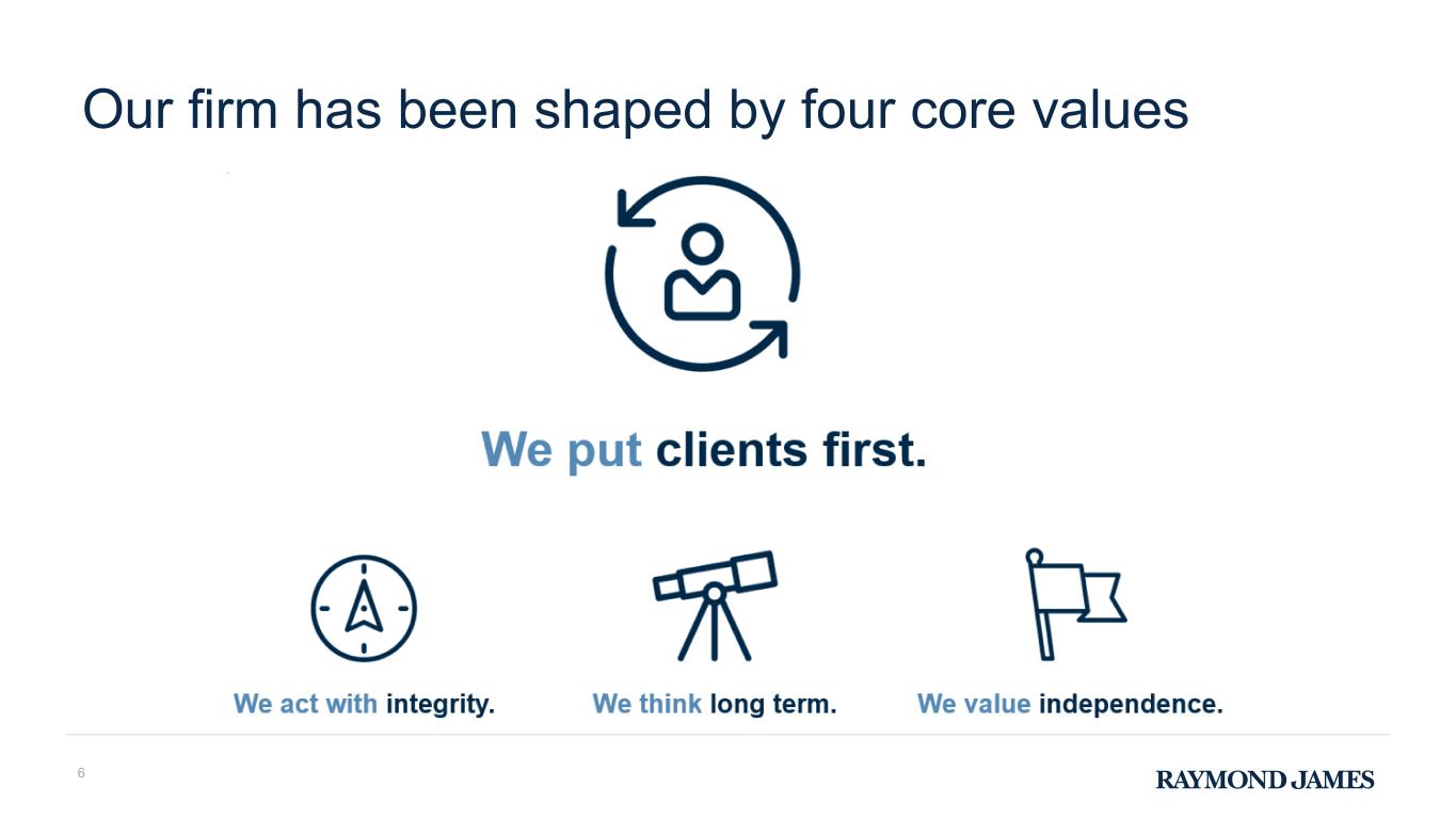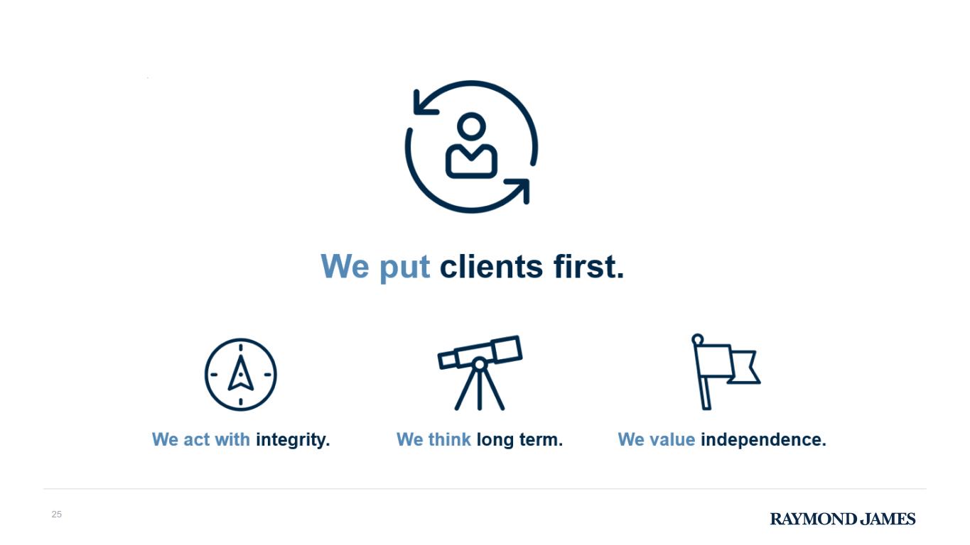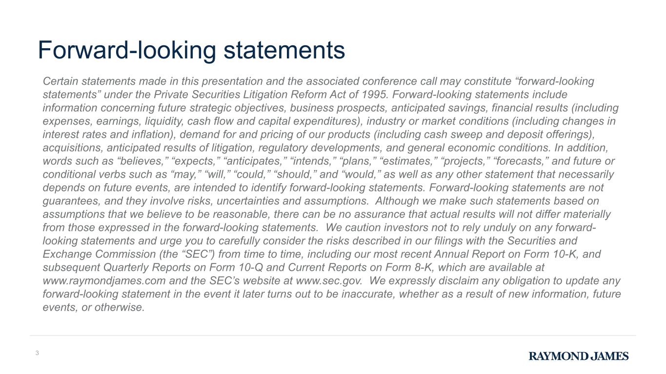 Certain statements made in this presentation and the associated conference call may constitute “forward-looking statements” under the Private Securities Litigation Reform Act of 1995. Forward-looking statements include information concerning future strategic objectives, business prospects, anticipated savings, financial results (including expenses, earnings, liquidity, cash flow and capital expenditures), industry or market conditions (including changes in interest rates and inflation), demand for and pricing of our products (including cash sweep and deposit offerings), acquisitions, anticipated results of litigation, regulatory developments, and general economic conditions. In addition, words such as “believes,” “expects,” “anticipates,” “intends,” “plans,” “estimates,” “projects,” “forecasts,” and future or conditional verbs such as “may,” “will,” “could,” “should,” and “would,” as well as any other statement that necessarily depends on future events, are intended to identify forward-looking statements. Forward-looking statements are not guarantees, and they involve risks, uncertainties and assumptions. Although we make such statements based on assumptions that we believe to be reasonable, there can be no assurance that actual results will not differ materially from those expressed in the forward-looking statements. We caution investors not to rely unduly on any forward- looking statements and urge you to carefully consider the risks described in our filings with the Securities and Exchange Commission (the “SEC”) from time to time, including our most recent Annual Report on Form 10-K, and subsequent Quarterly Reports on Form 10-Q and Current Reports on Form 8-K, which are available at www.raymondjames.com and the SEC’s website at www.sec.gov. We expressly disclaim any obligation to update any forward-looking statement in the event it later turns out to be inaccurate, whether as a result of new information, future events, or otherwise. Forward-looking statements 3