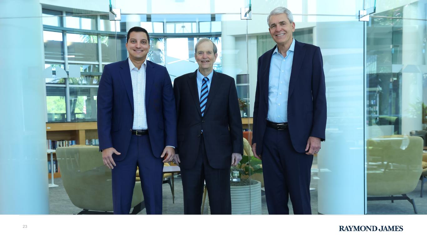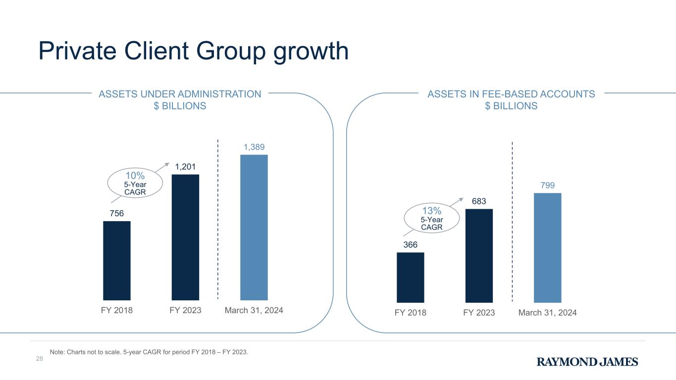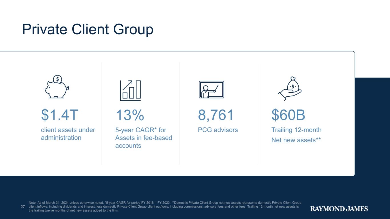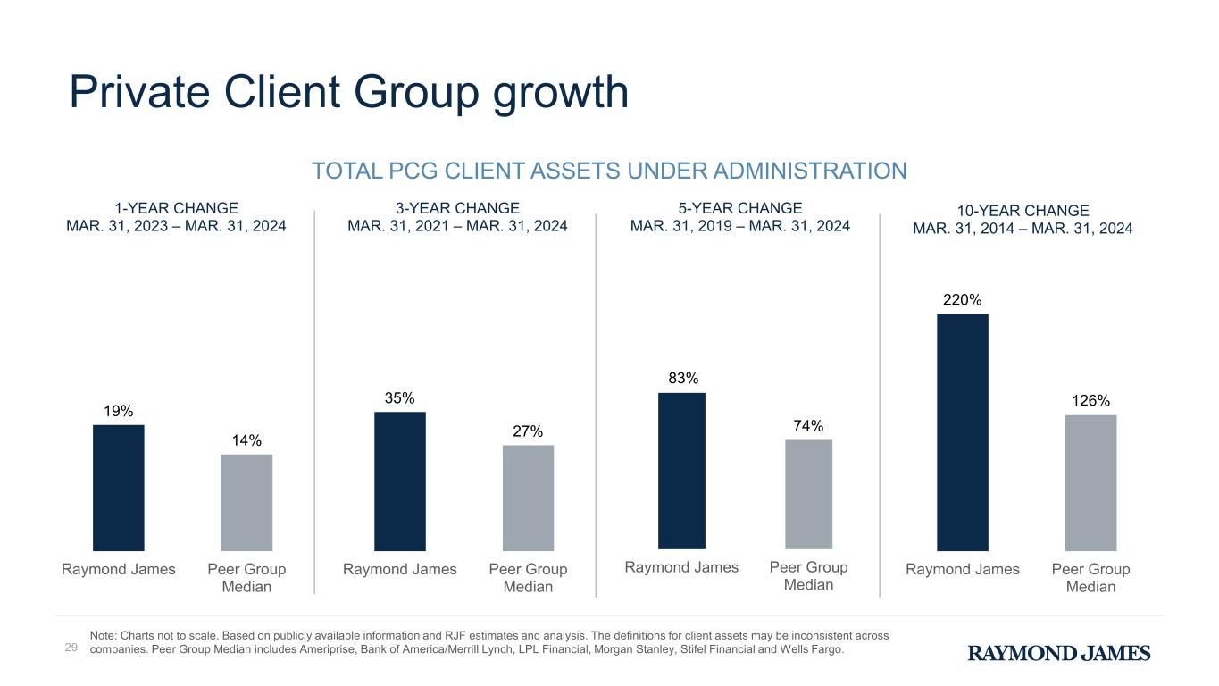 220% 126% Raymond James Peer Group Median 10-YEAR CHANGE MAR. 31, 2014 – MAR. 31, 2024 35% 27% Raymond James Peer Group Median 3-YEAR CHANGE MAR. 31, 2021 – MAR. 31, 2024 74% Raymond James Peer Group Median 5-YEAR CHANGE MAR. 31, 2019 – MAR. 31, 2024 TOTAL PCG CLIENT ASSETS UNDER ADMINISTRATION Note: Charts not to scale. Based on publicly available information and RJF estimates and analysis. The definitions for client assets may be inconsistent across companies. Peer Group Median includes Ameriprise, Bank of America/Merrill Lynch, LPL Financial, Morgan Stanley, Stifel Financial and Wells Fargo. 19% 14% Raymond James Peer Group Median 1-YEAR CHANGE MAR. 31, 2023 – MAR. 31, 2024 Private Client Group growth 83% 29