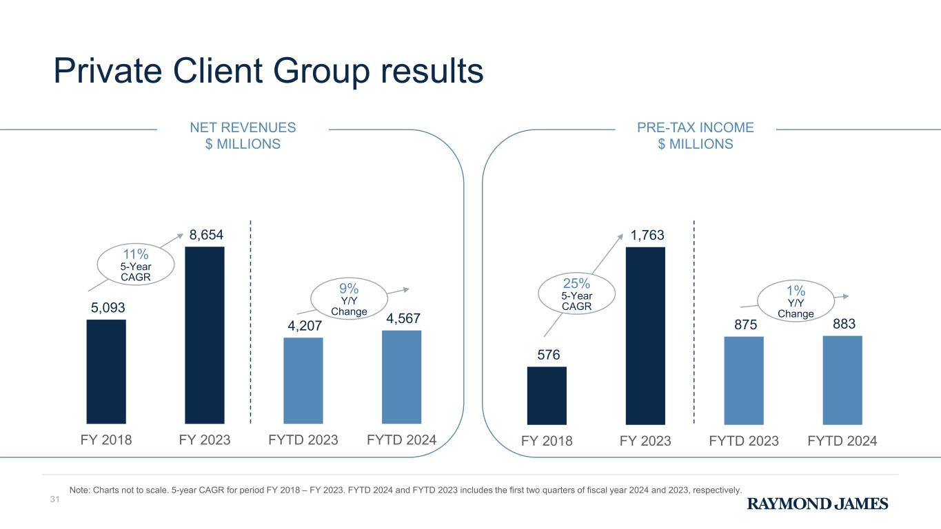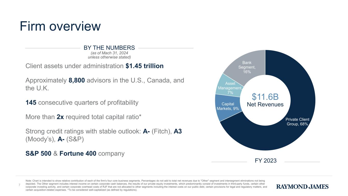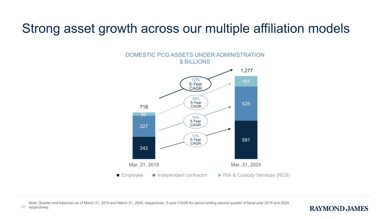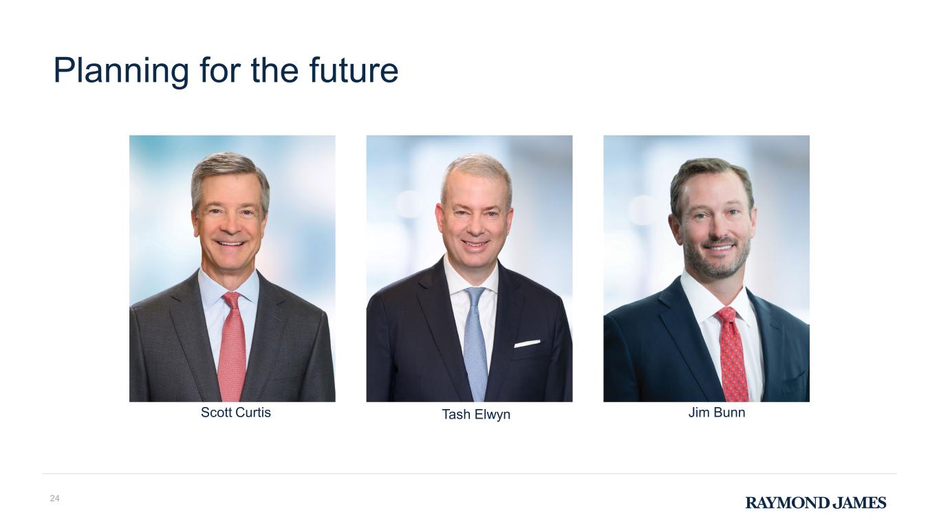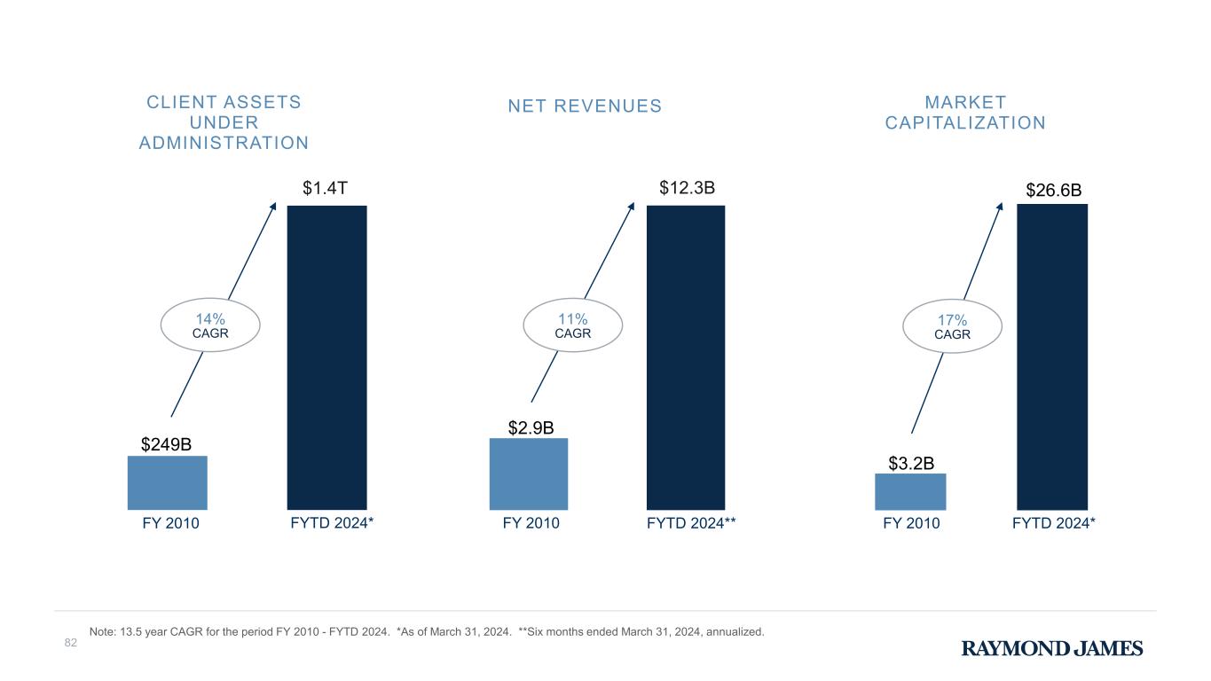 220% 126% Raymond James Peer Group Median 10-YEAR CHANGE MAR. 31, 2014 – MAR. 31, 2024 35% 27% Raymond James Peer Group Median 3-YEAR CHANGE MAR. 31, 2021 – MAR. 31, 2024 74% Raymond James Peer Group Median 5-YEAR CHANGE MAR. 31, 2019 – MAR. 31, 2024 TOTAL PCG CLIENT ASSETS UNDER ADMINISTRATION Note: Charts not to scale. Based on publicly available information and RJF estimates and analysis. The definitions for client assets may be inconsistent across companies. Peer Group Median includes Ameriprise, Bank of America/Merrill Lynch, LPL Financial, Morgan Stanley, Stifel Financial and Wells Fargo. 19% 14% Raymond James Peer Group Median 1-YEAR CHANGE MAR. 31, 2023 – MAR. 31, 2024 Private Client Group growth 83% 29