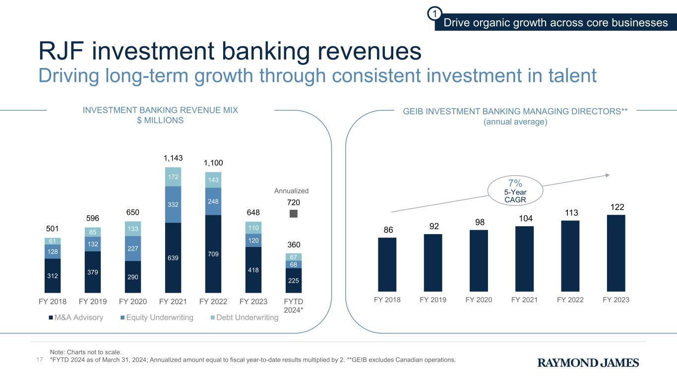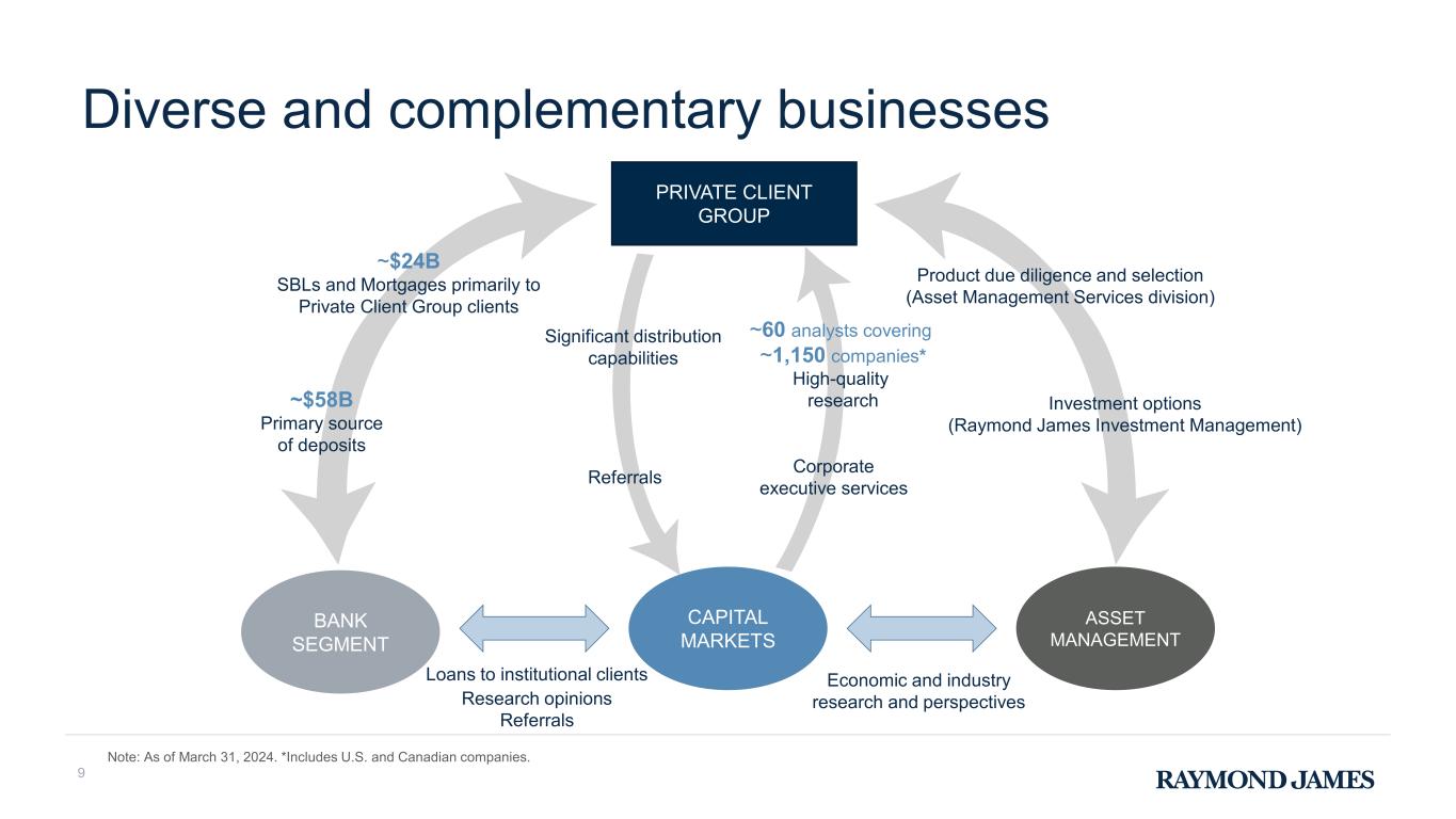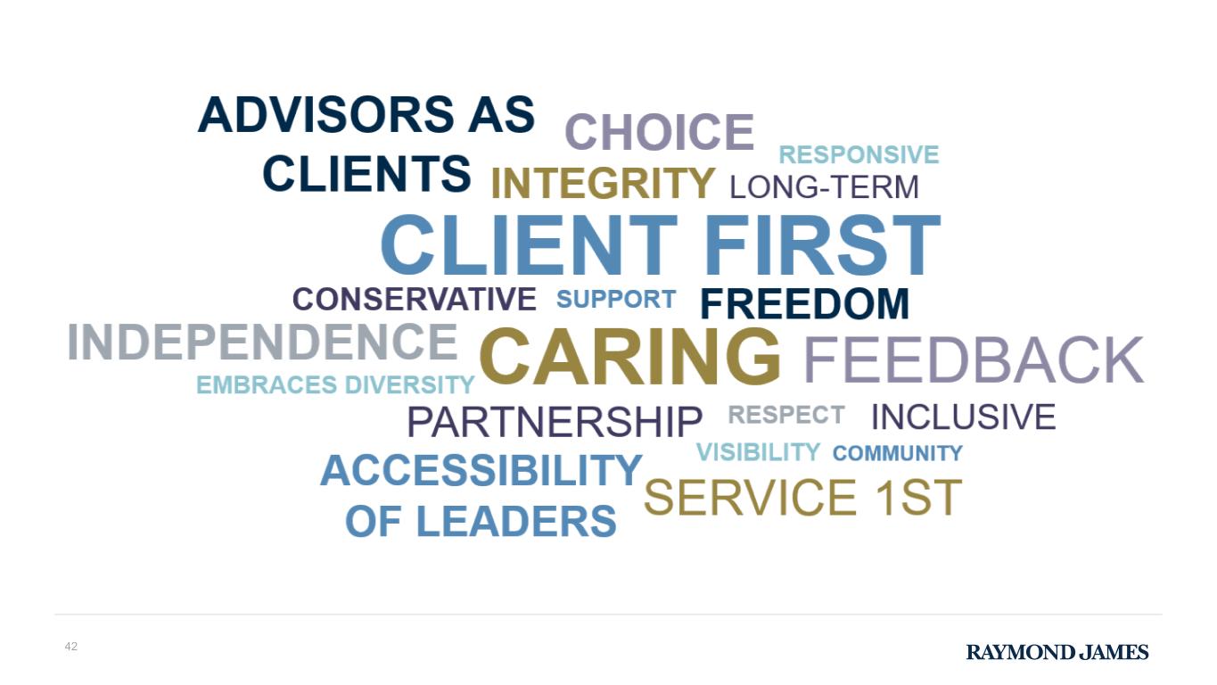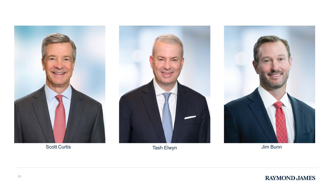 220% 126% Raymond James Peer Group Median 10-YEAR CHANGE MAR. 31, 2014 – MAR. 31, 2024 35% 27% Raymond James Peer Group Median 3-YEAR CHANGE MAR. 31, 2021 – MAR. 31, 2024 74% Raymond James Peer Group Median 5-YEAR CHANGE MAR. 31, 2019 – MAR. 31, 2024 TOTAL PCG CLIENT ASSETS UNDER ADMINISTRATION Note: Charts not to scale. Based on publicly available information and RJF estimates and analysis. The definitions for client assets may be inconsistent across companies. Peer Group Median includes Ameriprise, Bank of America/Merrill Lynch, LPL Financial, Morgan Stanley, Stifel Financial and Wells Fargo. 19% 14% Raymond James Peer Group Median 1-YEAR CHANGE MAR. 31, 2023 – MAR. 31, 2024 Private Client Group growth 83% 29