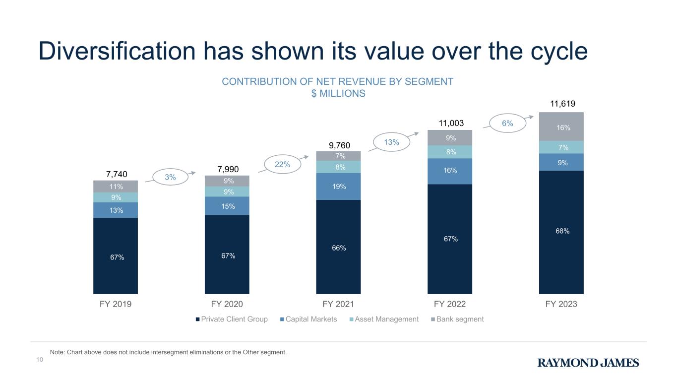 Note: Chart above does not include intersegment eliminations or the Other segment. 7,740 7,990 9,760 11,003 11,619 67% 67% 66% 67% 68% 13% 15% 19% 16% 9% 9% 9% 8% 8% 7% 11% 9% 7% 9% 16% FY 2019 FY 2020 FY 2021 FY 2022 FY 2023 Private Client Group Capital Markets Asset Management Bank segment CONTRIBUTION OF NET REVENUE BY SEGMENT $ MILLIONS Diversification has shown its value over the cycle 3% 22% 13% 6% 10
