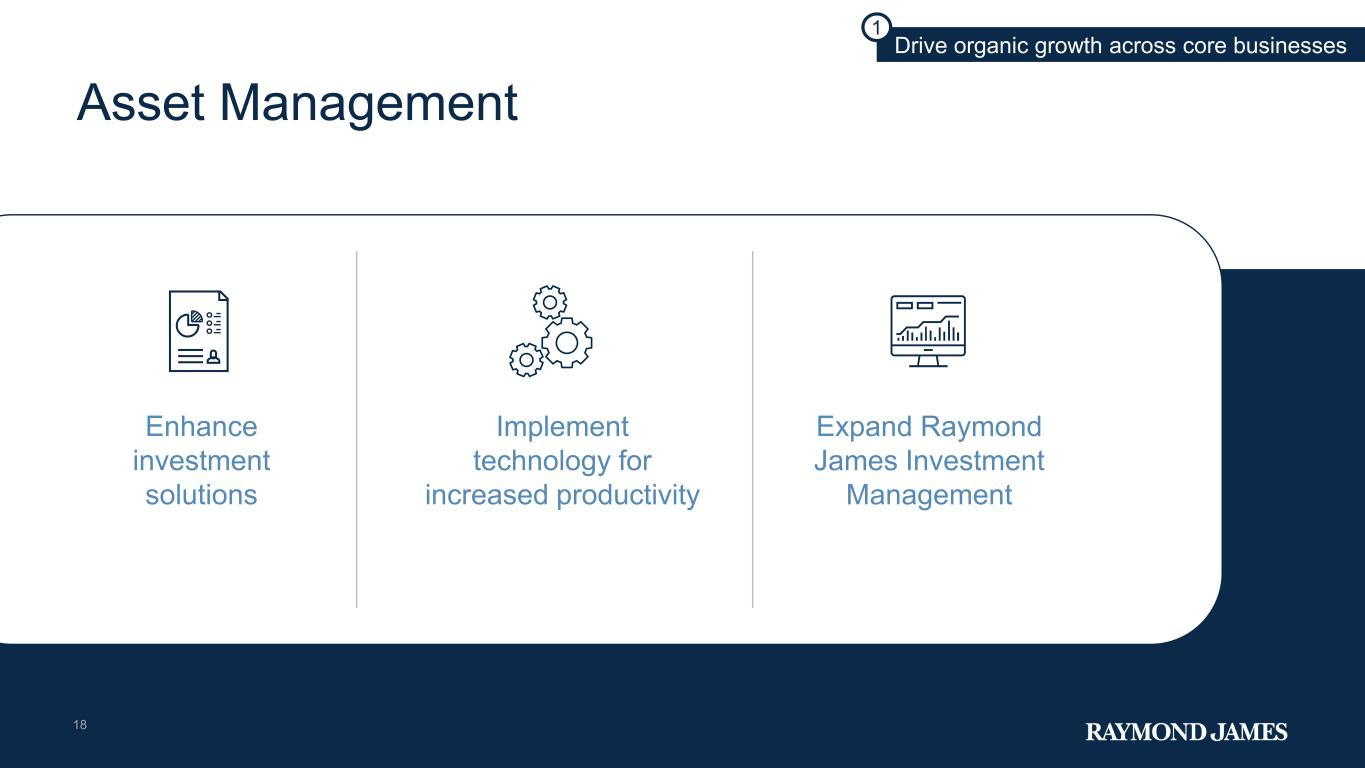 Drive organic growth across core businesses 1 Enhance investment solutions Implement technology for increased productivity Expand Raymond James Investment Management Asset Management 18
