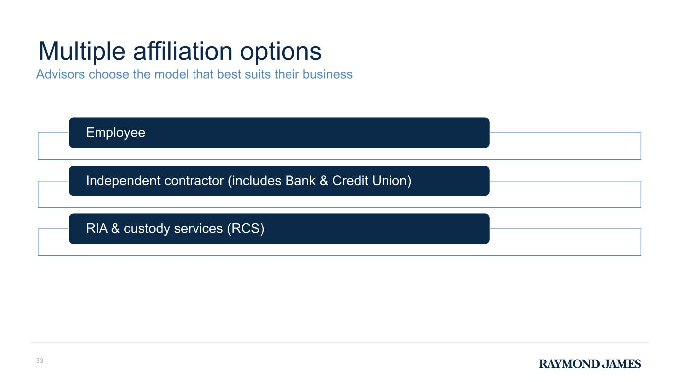 Multiple affiliation options Advisors choose the model that best suits their business Employee Independent contractor (includes Bank & Credit Union) RIA & custody services (RCS) 33