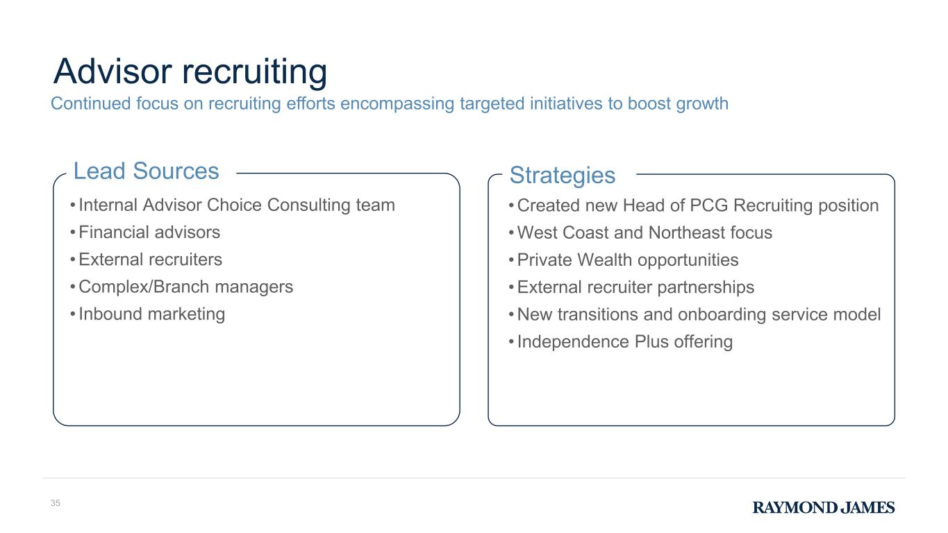 342 591 327 526 50 161 718 1,277 Mar. 31, 2019 Mar. 31, 2024 Employee Independent contractor RIA & Custody Services (RCS) DOMESTIC PCG ASSETS UNDER ADMINISTRATION $ BILLIONS 26% 5-Year CAGR 10% 5-Year CAGR 12% 5-Year CAGR 12% 5-Year CAGR Note: Quarter-end balances as of March 31, 2019 and March 31, 2024, respectively. 5-year CAGR for period ending second quarter of fiscal year 2019 and 2024, respectively. Strong asset growth across our multiple affiliation models 34