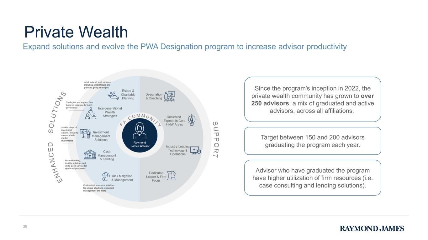 Since the program's inception in 2022, the private wealth community has grown to over 250 advisors, a mix of graduated and active advisors, across all affiliations. Target between 150 and 200 advisors graduating the program each year. Advisor who have graduated the program have higher utilization of firm resources (i.e. case consulting and lending solutions). Private Wealth Expand solutions and evolve the PWA Designation program to increase advisor productivity 38