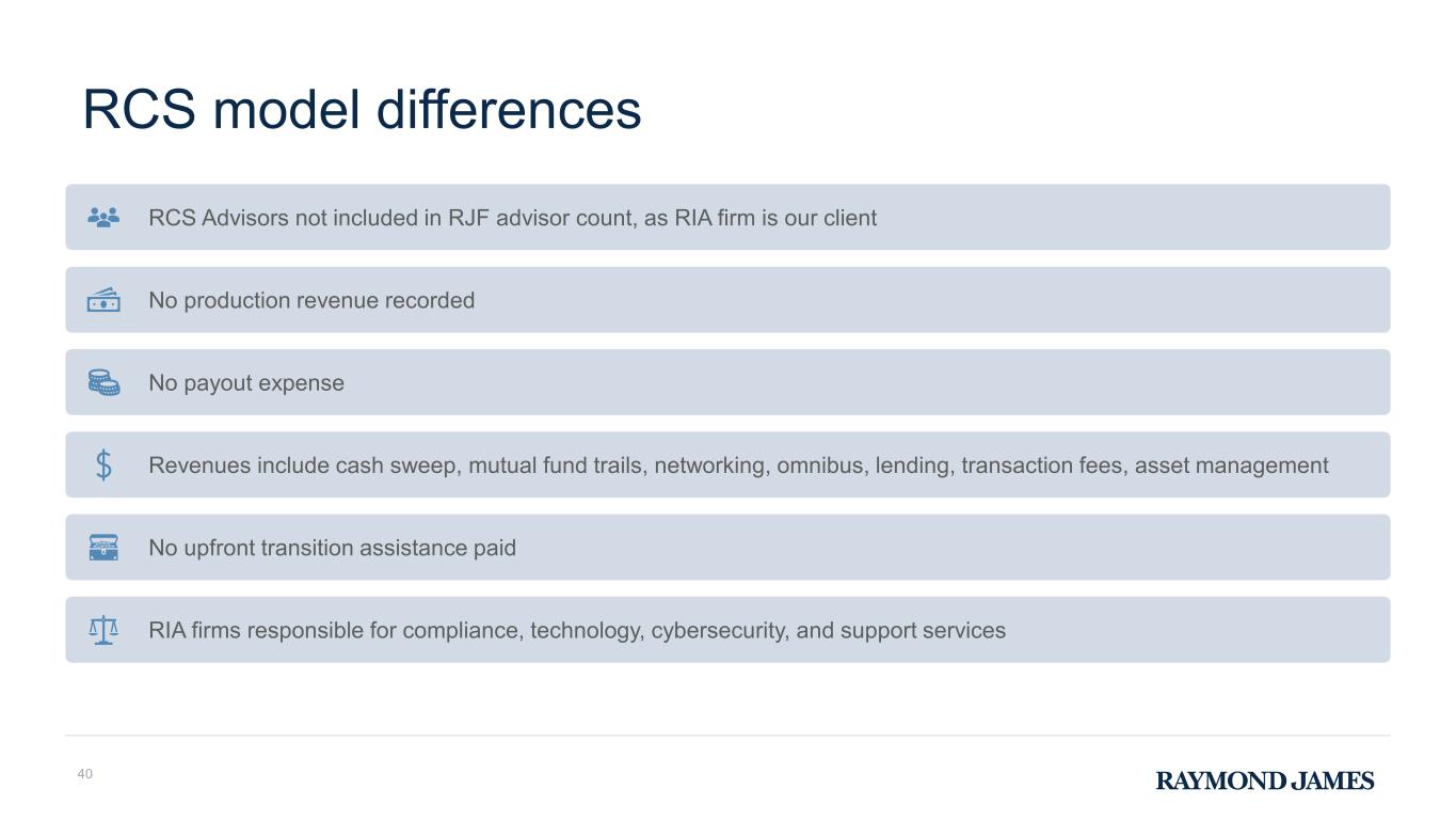 RCS Advisors not included in RJF advisor count, as RIA firm is our client No production revenue recorded No payout expense Revenues include cash sweep, mutual fund trails, networking, omnibus, lending, transaction fees, asset management No upfront transition assistance paid RIA firms responsible for compliance, technology, cybersecurity, and support services RCS model differences 40
