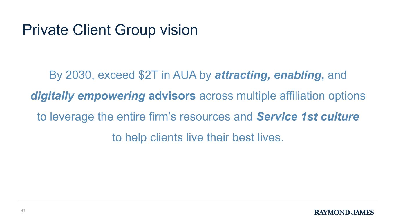 By 2030, exceed $2T in AUA by attracting, enabling, and digitally empowering advisors across multiple affiliation options to leverage the entire firm’s resources and Service 1st culture to help clients live their best lives. Private Client Group vision 41
