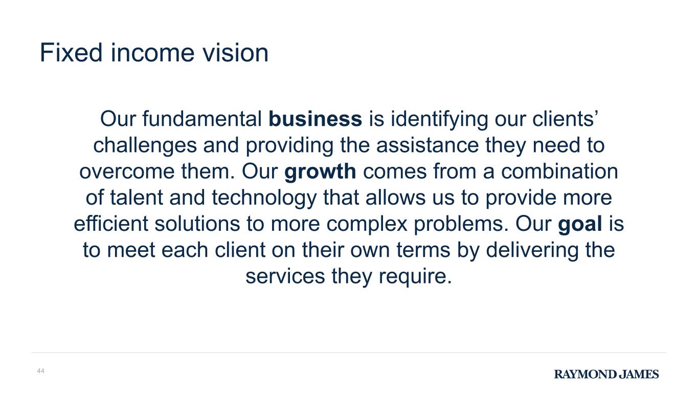 Our fundamental business is identifying our clients’ challenges and providing the assistance they need to overcome them. Our growth comes from a combination of talent and technology that allows us to provide more efficient solutions to more complex problems. Our goal is to meet each client on their own terms by delivering the services they require. Fixed income vision 44