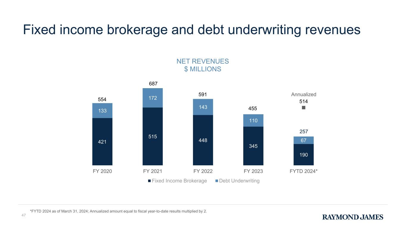 421 515 448 345 190 133 172 143 110 67 554 687 591 455 514 FY 2020 FY 2021 FY 2022 FY 2023 FYTD 2024* NET REVENUES $ MILLIONS Fixed Income Brokerage Debt Underwriting *FYTD 2024 as of March 31, 2024; Annualized amount equal to fiscal year-to-date results multiplied by 2. Fixed income brokerage and debt underwriting revenues 257 Annualized 47