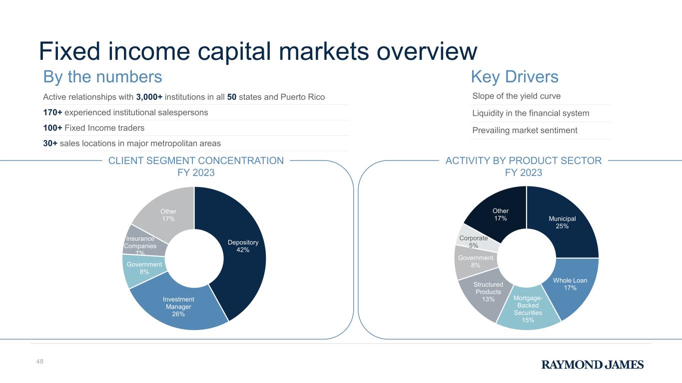 Slope of the yield curve Liquidity in the financial system Prevailing market sentiment Fixed income capital markets overview CLIENT SEGMENT CONCENTRATION FY 2023 ACTIVITY BY PRODUCT SECTOR FY 2023 Active relationships with 3,000+ institutions in all 50 states and Puerto Rico 170+ experienced institutional salespersons 100+ Fixed Income traders 30+ sales locations in major metropolitan areas By the numbers Key Drivers 48 Municipal 25% Whole Loan 17% Mortgage- Backed Securities 15% Structured Products 13% Government 8% Corporate 5% Other 17% Depository 42% Investment Manager 26% Government 8% Insurance Companies 7% Other 17%