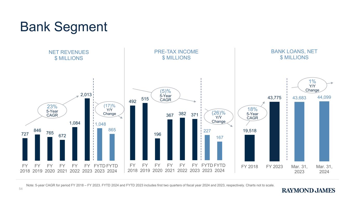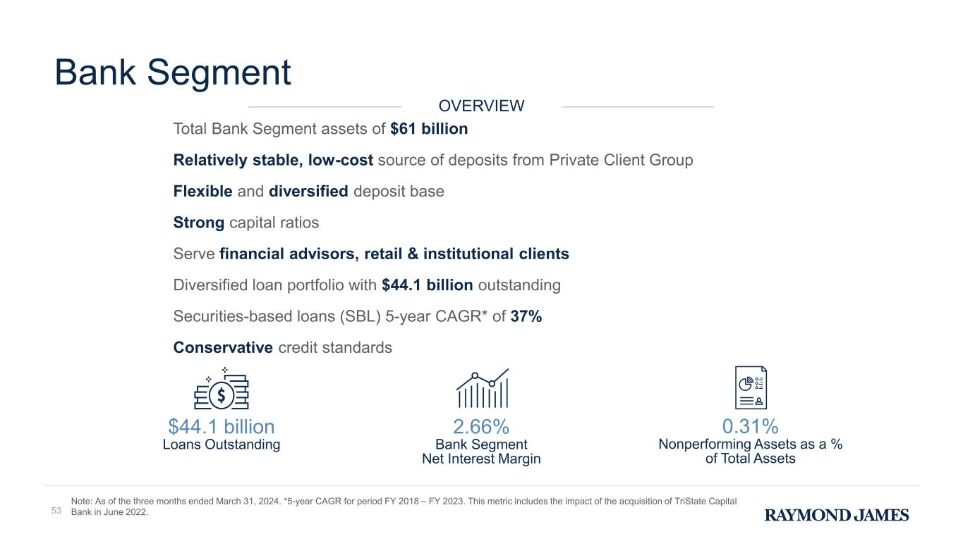 Note: As of the three months ended March 31, 2024. *5-year CAGR for period FY 2018 – FY 2023. This metric includes the impact of the acquisition of TriState Capital Bank in June 2022. OVERVIEW Total Bank Segment assets of $61 billion Relatively stable, low-cost source of deposits from Private Client Group Flexible and diversified deposit base Strong capital ratios Serve financial advisors, retail & institutional clients Diversified loan portfolio with $44.1 billion outstanding Securities-based loans (SBL) 5-year CAGR* of 37% Conservative credit standards $44.1 billion Loans Outstanding 2.66% Bank Segment Net Interest Margin 0.31% Nonperforming Assets as a % of Total Assets Bank Segment 53