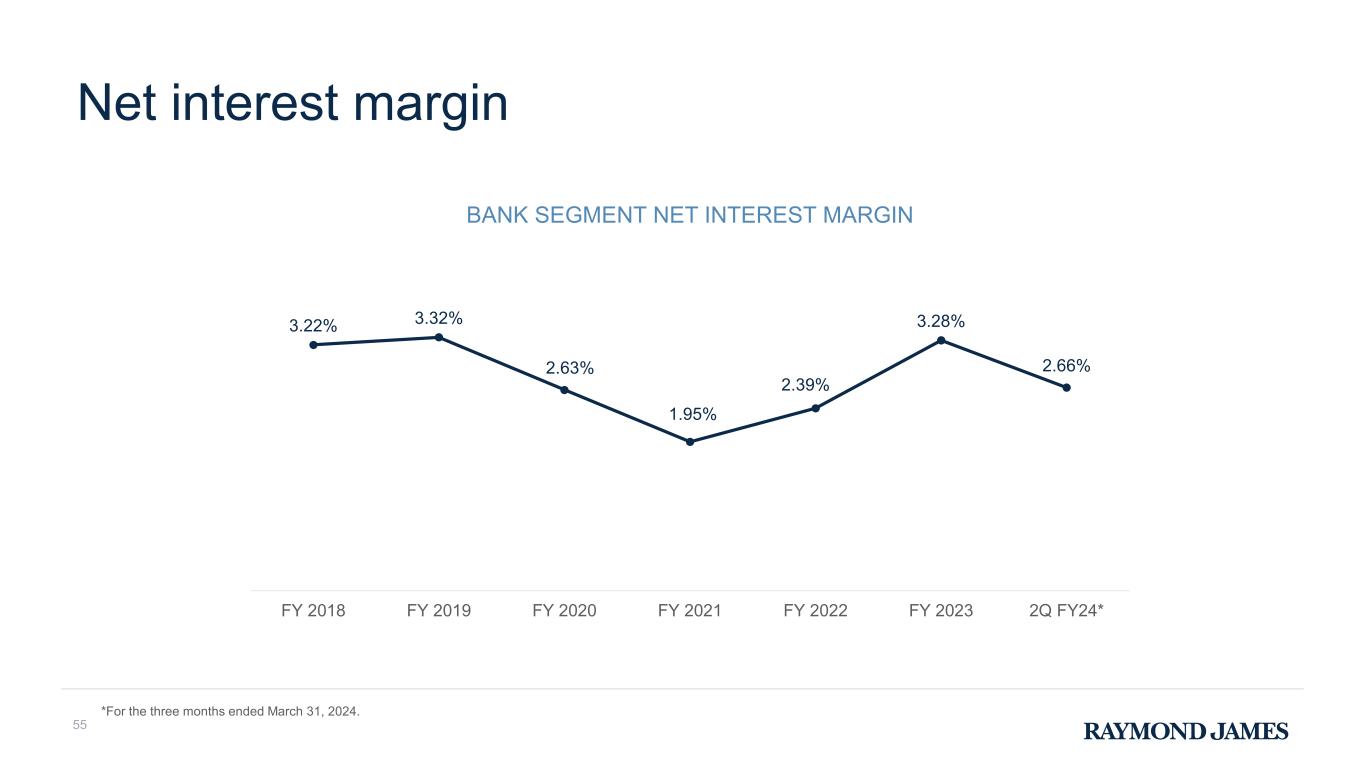 *In March 2023, we introduced our ESP, in which Private Client Group clients may deposit cash in a high-yield Raymond James Bank account. **3/31/2024 ESP balances include $324 million placed with third-party banks, which are not included in our bank deposit liability balance reflected on our Consolidated Statement of Financial Condition. 37.7 27.9 25.4 23.9 23.4 9.4 16.9 15.9 17.8 18.2 2.4 1.9 1.6 1.8 1.7 2.7 11.2 13.6 14.5 14.9 52.2 58.0 56.4 58.0 58.2 3/31/2023 6/30/2023 9/30/2023 12/31/2023 3/31/2024** RJBDP - Bank Segment RJBDP - Third-Party Banks CIP ESP* TOTAL CLIENTS’ DOMESTIC CASH SWEEP AND ENHANCED SAVINGS PROGRAM (ESP)* BALANCES $ BILLIONS Client cash balances 75