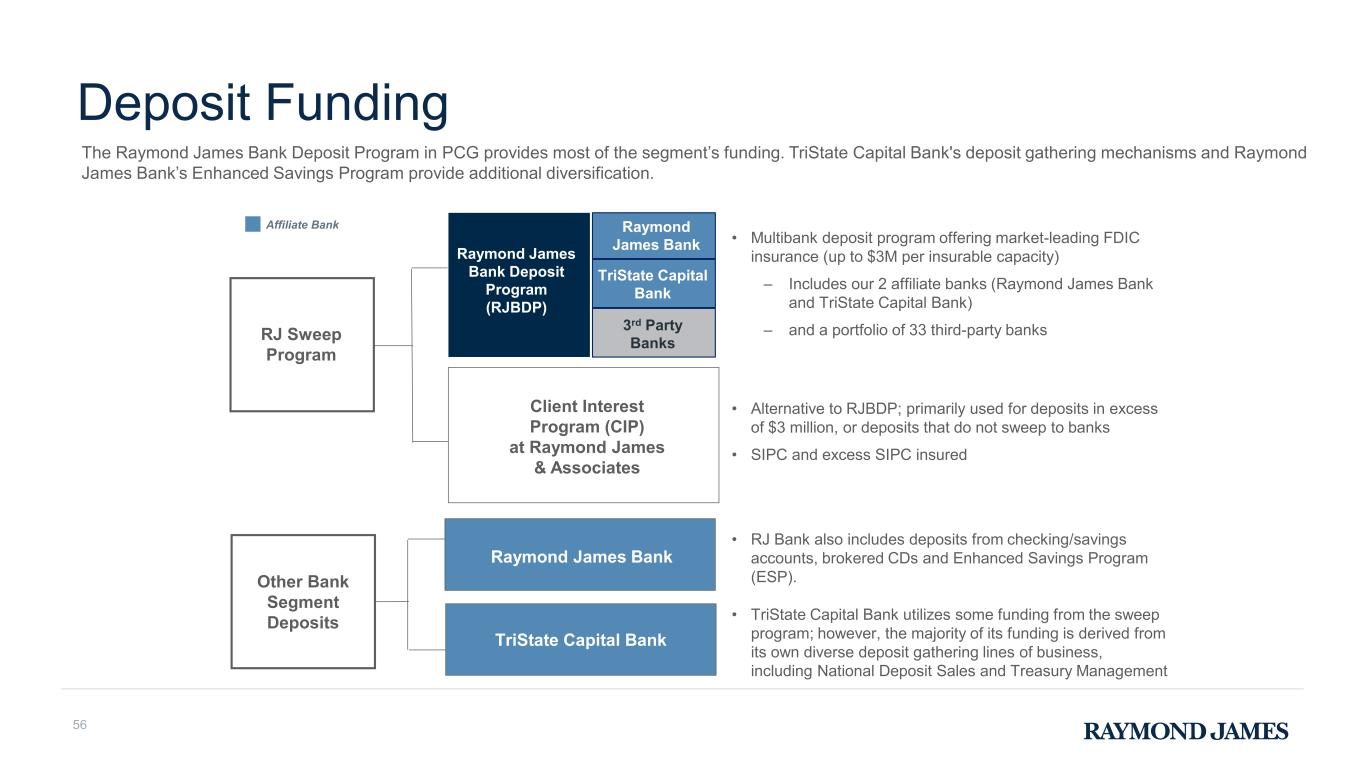 The Raymond James Bank Deposit Program in PCG provides most of the segment’s funding. TriState Capital Bank's deposit gathering mechanisms and Raymond James Bank’s Enhanced Savings Program provide additional diversification. RJ Sweep Program Client Interest Program (CIP) at Raymond James & Associates Raymond James Bank Deposit Program (RJBDP) Raymond James Bank TriState Capital Bank 3rd Party Banks • Multibank deposit program offering market-leading FDIC insurance (up to $3M per insurable capacity) ‒ Includes our 2 affiliate banks (Raymond James Bank and TriState Capital Bank) ‒ and a portfolio of 33 third-party banks • Alternative to RJBDP; primarily used for deposits in excess of $3 million, or deposits that do not sweep to banks • SIPC and excess SIPC insured Affiliate Bank Other Bank Segment Deposits TriState Capital Bank • TriState Capital Bank utilizes some funding from the sweep program; however, the majority of its funding is derived from its own diverse deposit gathering lines of business, including National Deposit Sales and Treasury Management Raymond James Bank • RJ Bank also includes deposits from checking/savings accounts, brokered CDs and Enhanced Savings Program (ESP). Deposit Funding 56