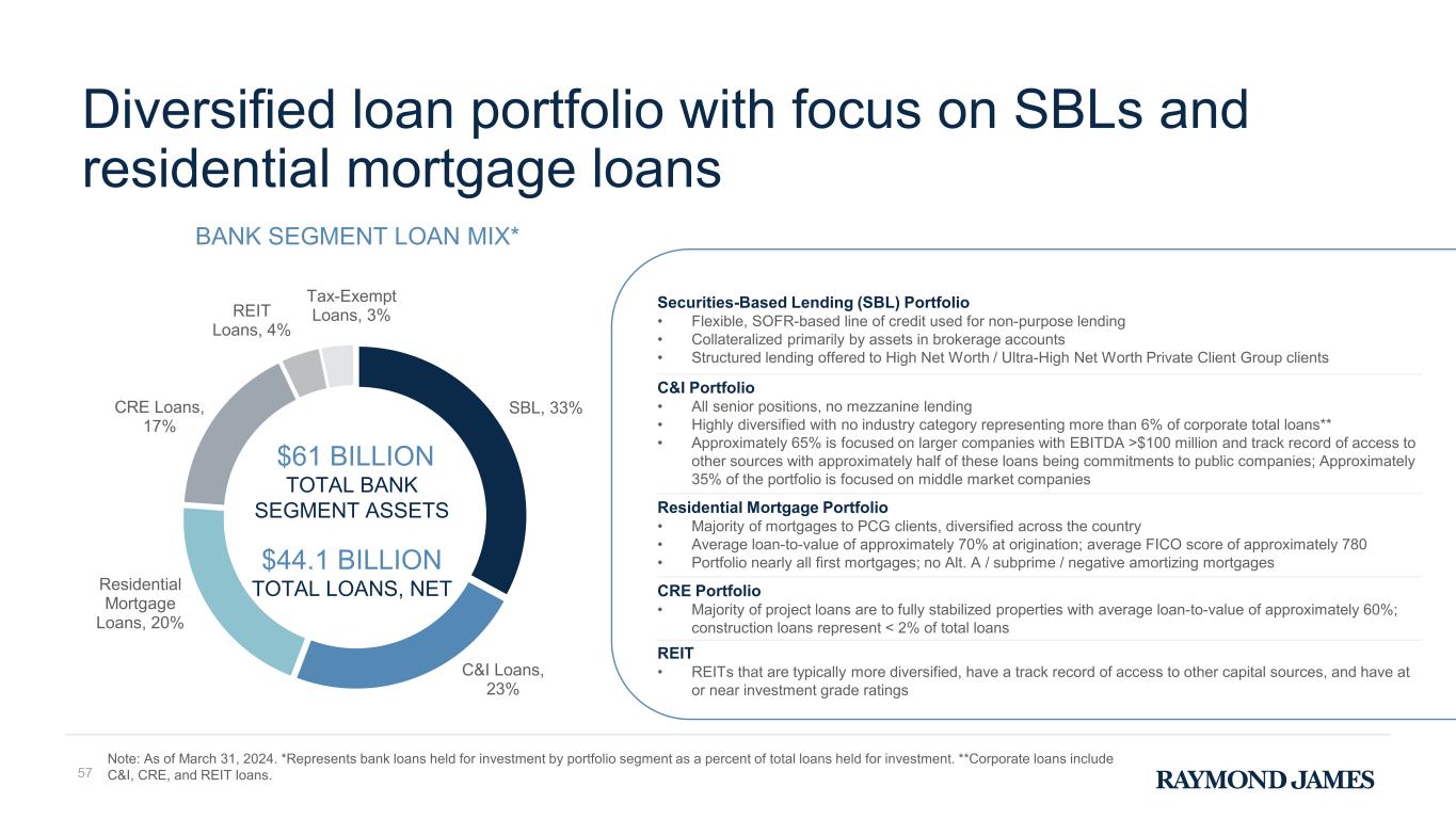 Note: As of March 31, 2024. *Represents bank loans held for investment by portfolio segment as a percent of total loans held for investment. **Corporate loans include C&I, CRE, and REIT loans. SBL, 33% C&I Loans, 23% Residential Mortgage Loans, 20% CRE Loans, 17% REIT Loans, 4% Tax-Exempt Loans, 3% BANK SEGMENT LOAN MIX* C&I Portfolio • All senior positions, no mezzanine lending • Highly diversified with no industry category representing more than 6% of corporate total loans** • Approximately 65% is focused on larger companies with EBITDA >$100 million and track record of access to other sources with approximately half of these loans being commitments to public companies; Approximately 35% of the portfolio is focused on middle market companies $61 BILLION TOTAL BANK SEGMENT ASSETS $44.1 BILLION TOTAL LOANS, NET CRE Portfolio • Majority of project loans are to fully stabilized properties with average loan-to-value of approximately 60%; construction loans represent < 2% of total loans REIT • REITs that are typically more diversified, have a track record of access to other capital sources, and have at or near investment grade ratings Residential Mortgage Portfolio • Majority of mortgages to PCG clients, diversified across the country • Average loan-to-value of approximately 70% at origination; average FICO score of approximately 780 • Portfolio nearly all first mortgages; no Alt. A / subprime / negative amortizing mortgages Securities-Based Lending (SBL) Portfolio • Flexible, SOFR-based line of credit used for non-purpose lending • Collateralized primarily by assets in brokerage accounts • Structured lending offered to High Net Worth / Ultra-High Net Worth Private Client Group clients Diversified loan portfolio with focus on SBLs and residential mortgage loans 57