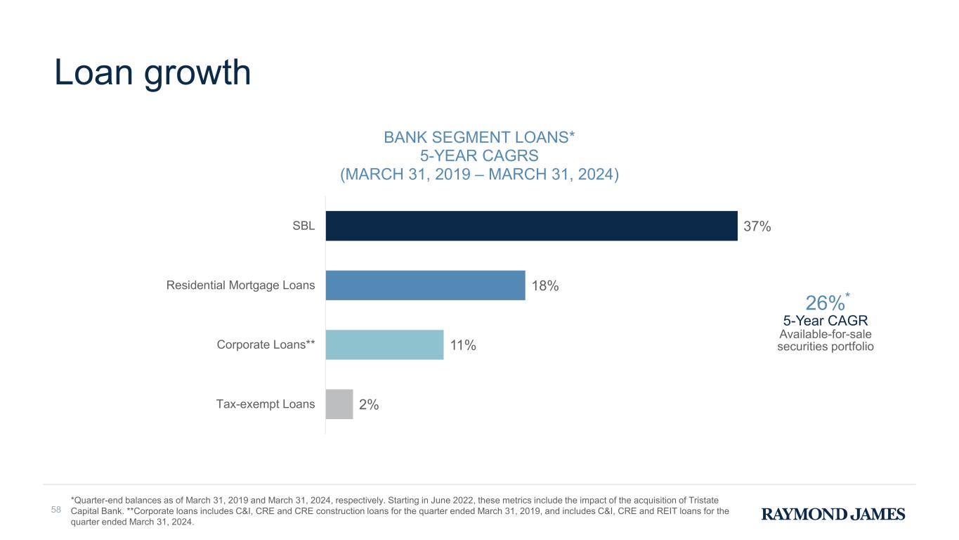 37% 18% 11% 2% SBL Residential Mortgage Loans Corporate Loans** Tax-exempt Loans BANK SEGMENT LOANS* 5-YEAR CAGRS (MARCH 31, 2019 – MARCH 31, 2024) 26% 5-Year CAGR Available-for-sale securities portfolio *Quarter-end balances as of March 31, 2019 and March 31, 2024, respectively. Starting in June 2022, these metrics include the impact of the acquisition of Tristate Capital Bank. **Corporate loans includes C&I, CRE and CRE construction loans for the quarter ended March 31, 2019, and includes C&I, CRE and REIT loans for the quarter ended March 31, 2024. Loan growth * 58