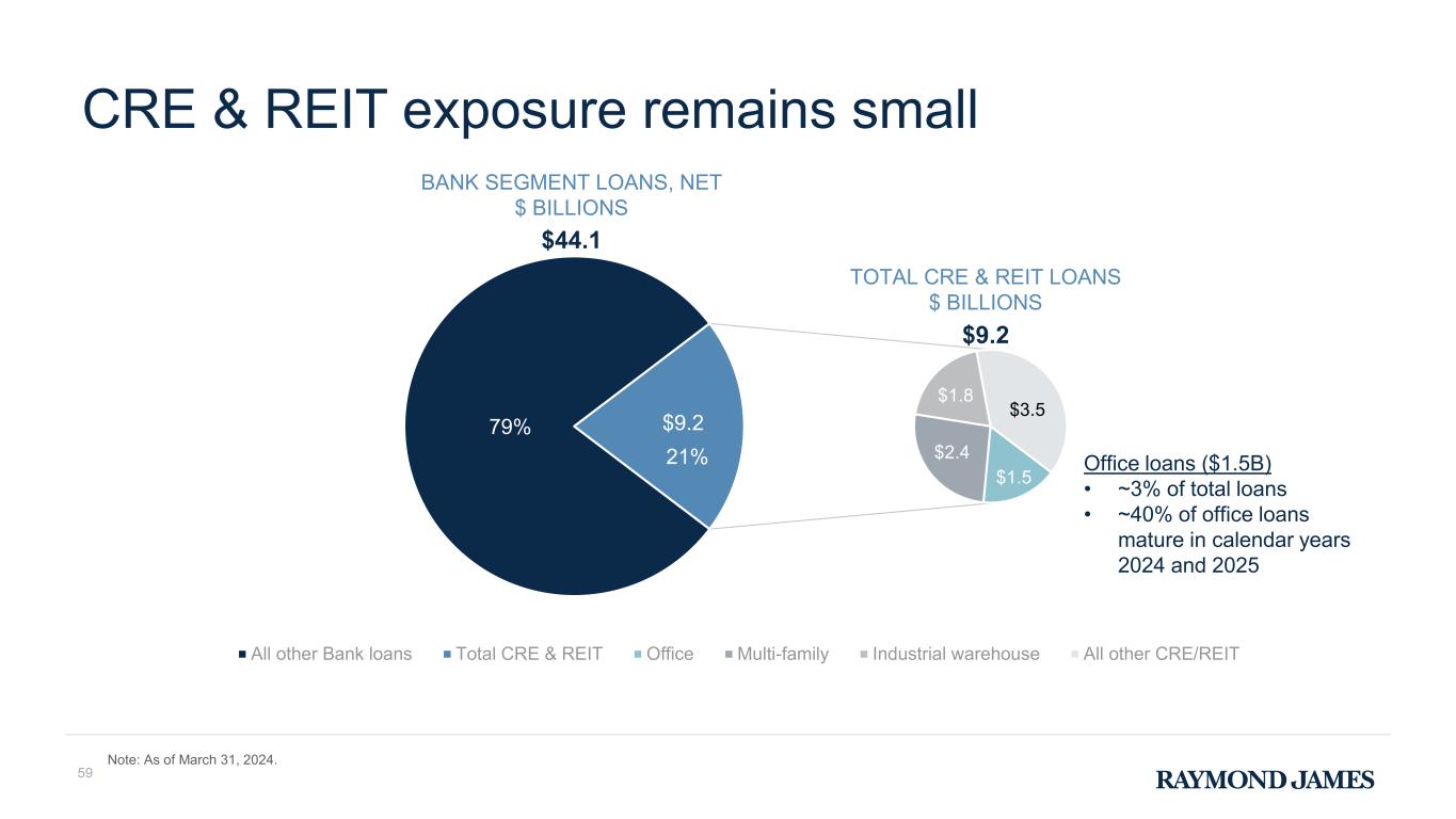 $1.5 $2.4 $1.8 $3.5 All other Bank loans Total CRE & REIT Office Multi-family Industrial warehouse All other CRE/REIT BANK SEGMENT LOANS, NET $ BILLIONS Office loans ($1.5B) • ~3% of total loans • ~40% of office loans mature in calendar years 2024 and 2025 TOTAL CRE & REIT LOANS $ BILLIONS $44.1 $9.2 Note: As of March 31, 2024. CRE & REIT exposure remains small 21% 79% $9.2 59