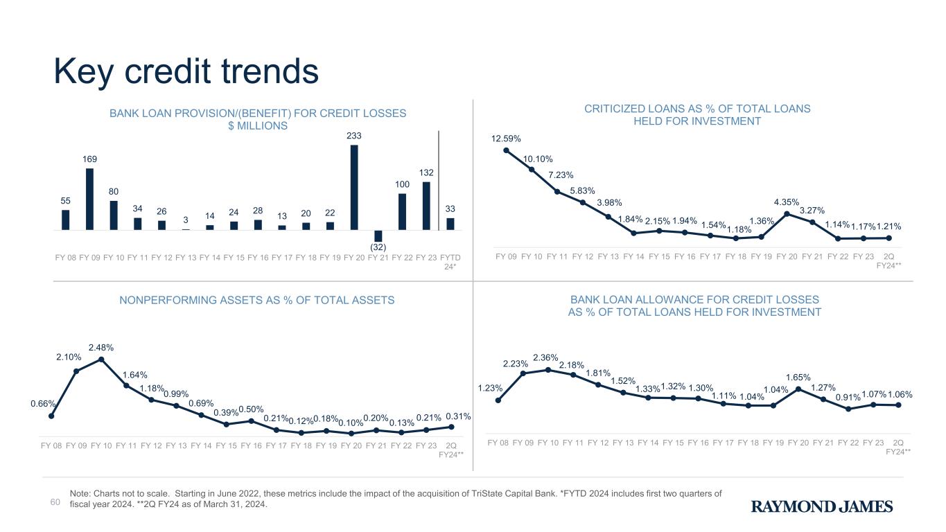 55 169 80 34 26 3 14 24 28 13 20 22 233 (32) 100 132 33 FY 08 FY 09 FY 10 FY 11 FY 12 FY 13 FY 14 FY 15 FY 16 FY 17 FY 18 FY 19 FY 20 FY 21 FY 22 FY 23 FYTD 24* BANK LOAN PROVISION/(BENEFIT) FOR CREDIT LOSSES $ MILLIONS 12.59% 10.10% 7.23% 5.83% 3.98% 1.84% 2.15% 1.94% 1.54%1.18% 1.36% 4.35% 3.27% 1.14%1.17%1.21% FY 09 FY 10 FY 11 FY 12 FY 13 FY 14 FY 15 FY 16 FY 17 FY 18 FY 19 FY 20 FY 21 FY 22 FY 23 2Q FY24** CRITICIZED LOANS AS % OF TOTAL LOANS HELD FOR INVESTMENT 0.66% 2.10% 2.48% 1.64% 1.18%0.99% 0.69% 0.39%0.50% 0.21%0.12%0.18%0.10%0.20%0.13% 0.21% 0.31% FY 08 FY 09 FY 10 FY 11 FY 12 FY 13 FY 14 FY 15 FY 16 FY 17 FY 18 FY 19 FY 20 FY 21 FY 22 FY 23 2Q FY24** NONPERFORMING ASSETS AS % OF TOTAL ASSETS 1.23% 2.23% 2.36% 2.18% 1.81% 1.52% 1.33%1.32% 1.30% 1.11% 1.04% 1.04% 1.65% 1.27% 0.91%1.07%1.06% FY 08 FY 09 FY 10 FY 11 FY 12 FY 13 FY 14 FY 15 FY 16 FY 17 FY 18 FY 19 FY 20 FY 21 FY 22 FY 23 2Q FY24** BANK LOAN ALLOWANCE FOR CREDIT LOSSES AS % OF TOTAL LOANS HELD FOR INVESTMENT Note: Charts not to scale. Starting in June 2022, these metrics include the impact of the acquisition of TriState Capital Bank. *FYTD 2024 includes first two quarters of fiscal year 2024. **2Q FY24 as of March 31, 2024. Key credit trends 60