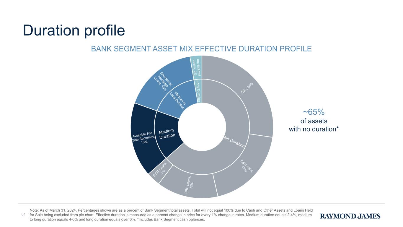 BANK SEGMENT ASSET MIX EFFECTIVE DURATION PROFILE Note: As of March 31, 2024. Percentages shown are as a percent of Bank Segment total assets. Total will not equal 100% due to Cash and Other Assets and Loans Held for Sale being excluded from pie chart. Effective duration is measured as a percent change in price for every 1% change in rates. Medium duration equals 2-4%, medium to long duration equals 4-6% and long duration equals over 6%. *Includes Bank Segment cash balances. Duration profile ~65% of assets with no duration* 61