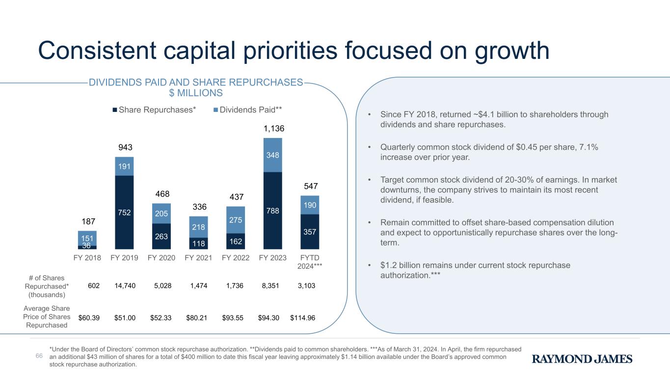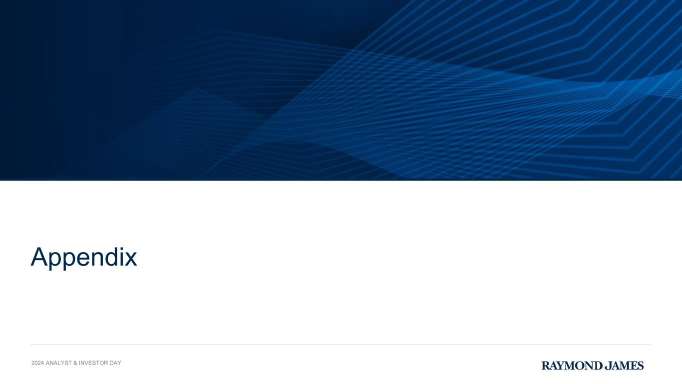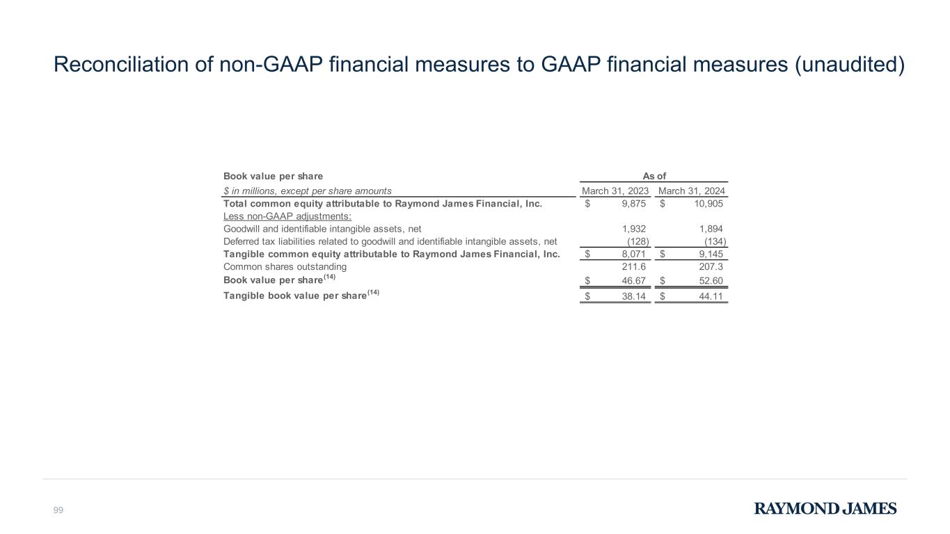 Reconciliation of non-GAAP financial measures to GAAP financial measures (unaudited) Book value per share $ in millions, except per share amounts March 31, 2023 March 31, 2024 Total common equity attributable to Raymond James Financial, Inc. 9,875$ 10,905$ Less non-GAAP adjustments: Goodwill and identifiable intangible assets, net 1,932 1,894 Deferred tax liabilities related to goodwill and identifiable intangible assets, net (128) (134) Tangible common equity attributable to Raymond James Financial, Inc. 8,071$ 9,145$ Common shares outstanding 211.6 207.3 Book value per share(14) 46.67$ 52.60$ Tangible book value per share(14) 38.14$ 44.11$ As of 99