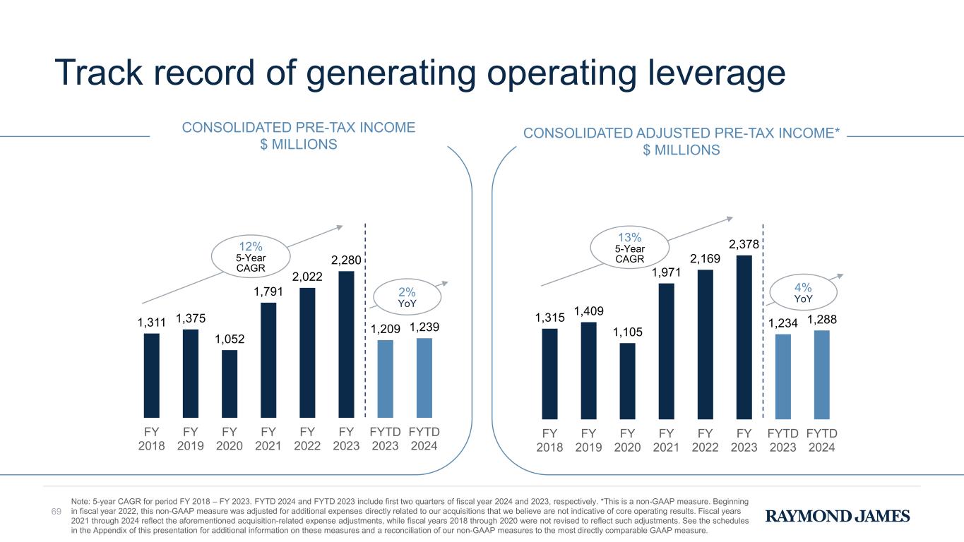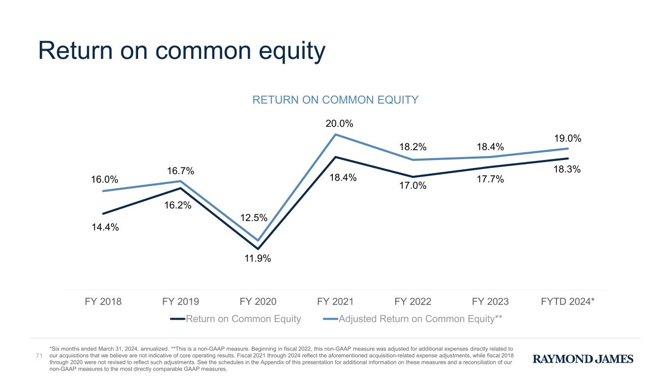1,311 1,375 1,052 1,791 2,022 2,280 1,209 1,239 FY 2018 FY 2019 FY 2020 FY 2021 FY 2022 FY 2023 FYTD 2023 FYTD 2024 12% 5-Year CAGR CONSOLIDATED PRE-TAX INCOME $ MILLIONS 1,315 1,409 1,105 1,971 2,169 2,378 1,234 1,288 FY 2018 FY 2019 FY 2020 FY 2021 FY 2022 FY 2023 FYTD 2023 FYTD 2024 13% 5-Year CAGR CONSOLIDATED ADJUSTED PRE-TAX INCOME* $ MILLIONS 2% YoY 4% YoY Track record of generating operating leverage Note: 5-year CAGR for period FY 2018 – FY 2023. FYTD 2024 and FYTD 2023 include first two quarters of fiscal year 2024 and 2023, respectively. *This is a non-GAAP measure. Beginning in fiscal year 2022, this non-GAAP measure was adjusted for additional expenses directly related to our acquisitions that we believe are not indicative of core operating results. Fiscal years 2021 through 2024 reflect the aforementioned acquisition-related expense adjustments, while fiscal years 2018 through 2020 were not revised to reflect such adjustments. See the schedules in the Appendix of this presentation for additional information on these measures and a reconciliation of our non-GAAP measures to the most directly comparable GAAP measure. 69