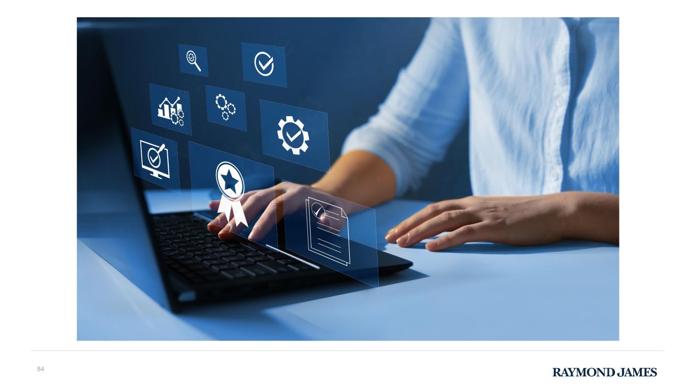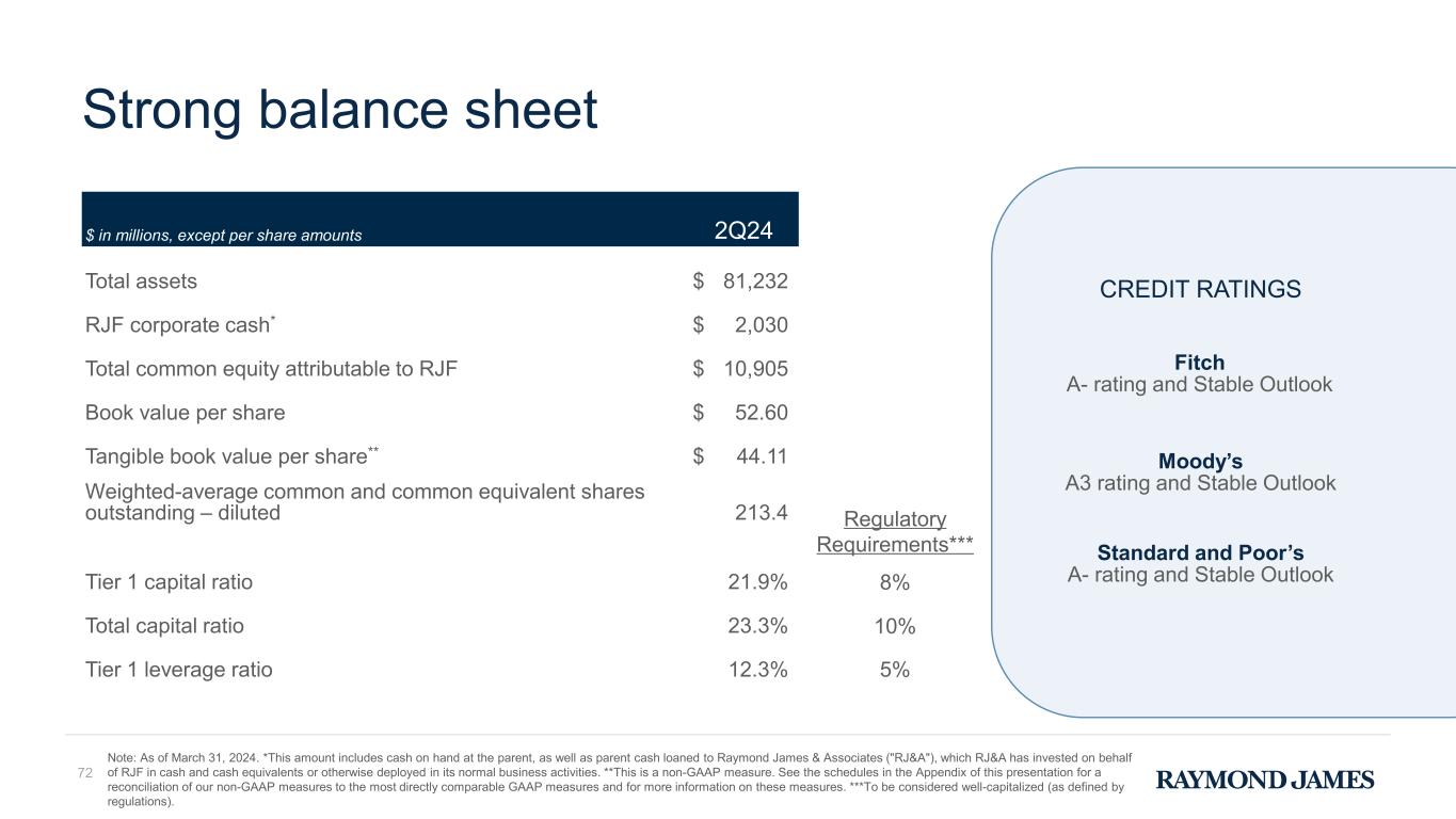 $ in millions, except per share amounts 2Q24 Total assets $ 81,232 RJF corporate cash* $ 2,030 Total common equity attributable to RJF $ 10,905 Book value per share $ 52.60 Tangible book value per share** $ 44.11 Weighted-average common and common equivalent shares outstanding – diluted 213.4 Tier 1 capital ratio 21.9% Total capital ratio 23.3% Tier 1 leverage ratio 12.3% Regulatory Requirements*** 8% 10% 5% CREDIT RATINGS Moody’s A3 rating and Stable Outlook Standard and Poor’s A- rating and Stable Outlook Fitch A- rating and Stable Outlook Strong balance sheet Note: As of March 31, 2024. *This amount includes cash on hand at the parent, as well as parent cash loaned to Raymond James & Associates ("RJ&A"), which RJ&A has invested on behalf of RJF in cash and cash equivalents or otherwise deployed in its normal business activities. **This is a non-GAAP measure. See the schedules in the Appendix of this presentation for a reconciliation of our non-GAAP measures to the most directly comparable GAAP measures and for more information on these measures. ***To be considered well-capitalized (as defined by regulations). 72