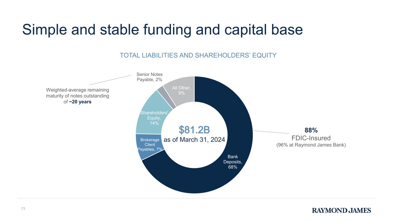 Bank Deposits, 68% Brokerage Client Payables, 7% Shareholders' Equity, 14% Senior Notes Payable, 2% All Other, 9% TOTAL LIABILITIES AND SHAREHOLDERS’ EQUITY as of March 31, 2024 Weighted-average remaining maturity of notes outstanding of ~20 years 88% FDIC-Insured (96% at Raymond James Bank) Simple and stable funding and capital base 73