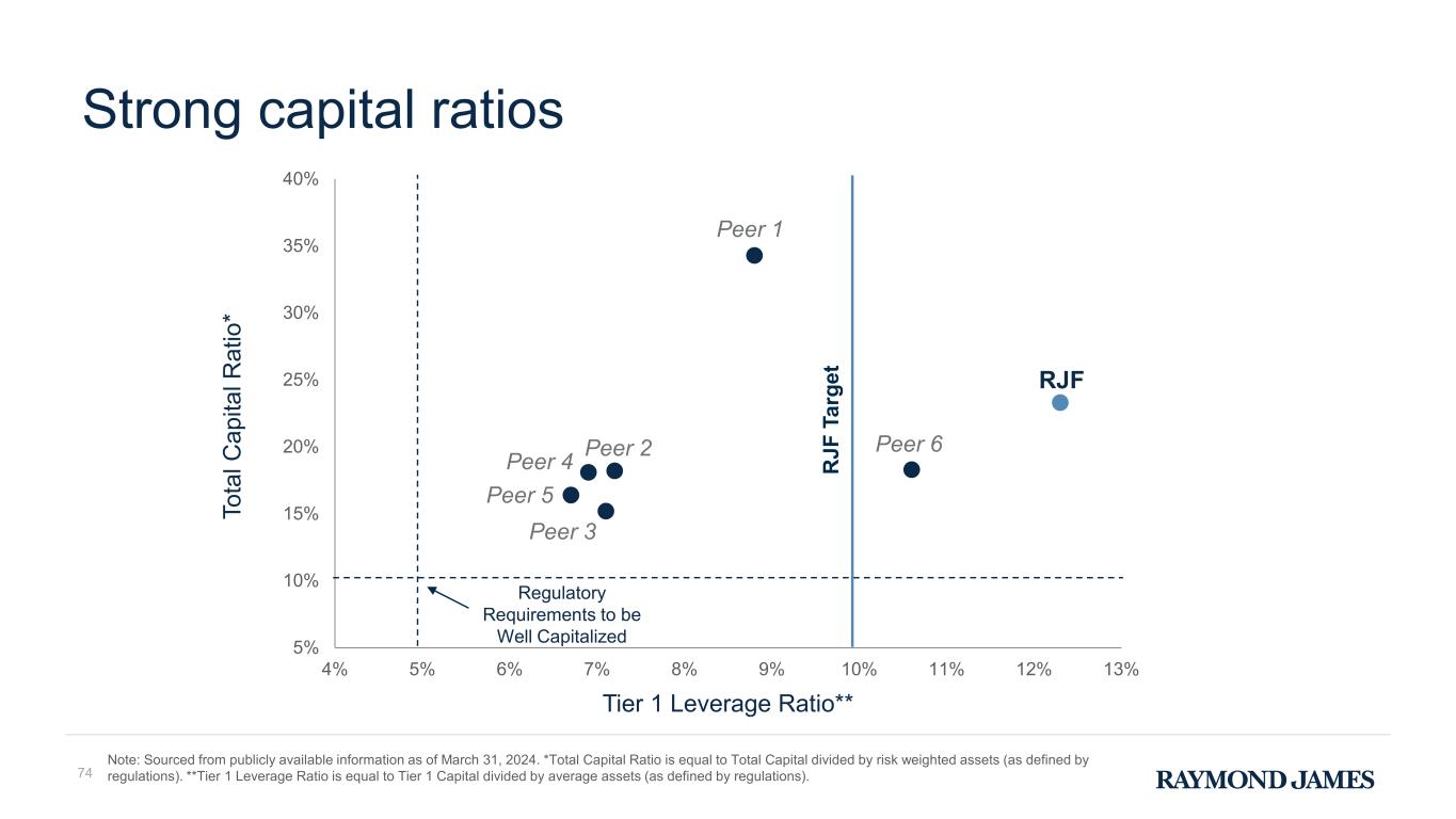 5% 10% 15% 20% 25% 30% 35% 40% 4% 5% 6% 7% 8% 9% 10% 11% 12% 13% To ta l C ap ita l R at io * Tier 1 Leverage Ratio** Peer 2 Peer 3 Peer 4 Peer 5 Peer 6 RJF Peer 1 Regulatory Requirements to be Well Capitalized R JF T ar ge t Note: Sourced from publicly available information as of March 31, 2024. *Total Capital Ratio is equal to Total Capital divided by risk weighted assets (as defined by regulations). **Tier 1 Leverage Ratio is equal to Tier 1 Capital divided by average assets (as defined by regulations). Strong capital ratios 74