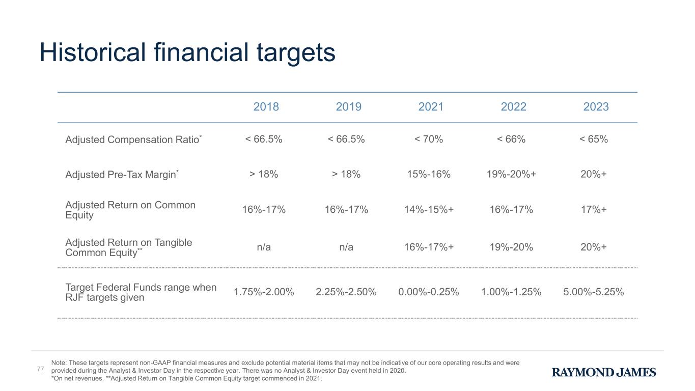 2018 2019 2021 2022 2023 Adjusted Compensation Ratio* < 66.5% < 66.5% < 70% < 66% < 65% Adjusted Pre-Tax Margin* > 18% > 18% 15%-16% 19%-20%+ 20%+ Adjusted Return on Common Equity 16%-17% 16%-17% 14%-15%+ 16%-17% 17%+ Adjusted Return on Tangible Common Equity** n/a n/a 16%-17%+ 19%-20% 20%+ Target Federal Funds range when RJF targets given 1.75%-2.00% 2.25%-2.50% 0.00%-0.25% 1.00%-1.25% 5.00%-5.25% Note: These targets represent non-GAAP financial measures and exclude potential material items that may not be indicative of our core operating results and were provided during the Analyst & Investor Day in the respective year. There was no Analyst & Investor Day event held in 2020. *On net revenues. **Adjusted Return on Tangible Common Equity target commenced in 2021. Historical financial targets 77