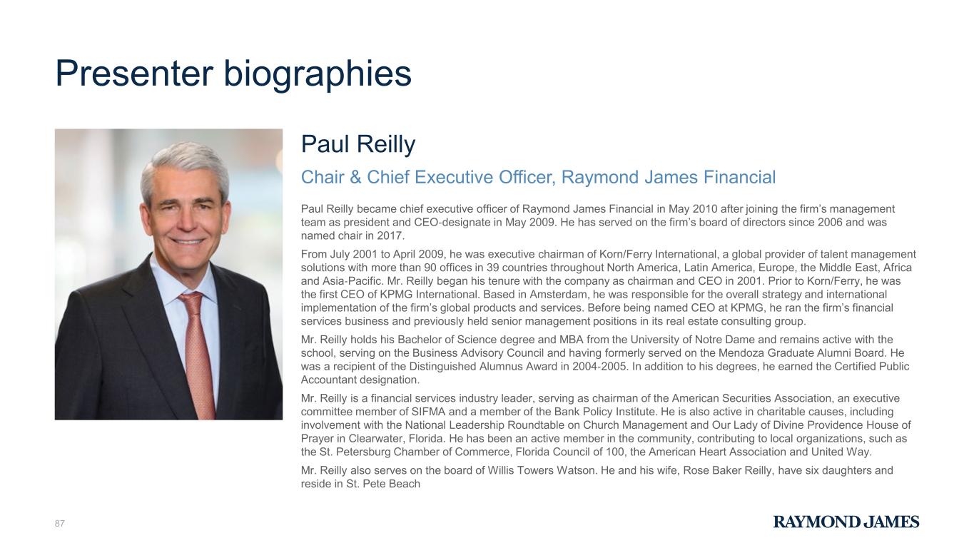 Paul Reilly Paul Reilly became chief executive officer of Raymond James Financial in May 2010 after joining the firm’s management team as president and CEO‐designate in May 2009. He has served on the firm’s board of directors since 2006 and was named chair in 2017. From July 2001 to April 2009, he was executive chairman of Korn/Ferry International, a global provider of talent management solutions with more than 90 offices in 39 countries throughout North America, Latin America, Europe, the Middle East, Africa and Asia‐Pacific. Mr. Reilly began his tenure with the company as chairman and CEO in 2001. Prior to Korn/Ferry, he was the first CEO of KPMG International. Based in Amsterdam, he was responsible for the overall strategy and international implementation of the firm’s global products and services. Before being named CEO at KPMG, he ran the firm’s financial services business and previously held senior management positions in its real estate consulting group. Mr. Reilly holds his Bachelor of Science degree and MBA from the University of Notre Dame and remains active with the school, serving on the Business Advisory Council and having formerly served on the Mendoza Graduate Alumni Board. He was a recipient of the Distinguished Alumnus Award in 2004‐2005. In addition to his degrees, he earned the Certified Public Accountant designation. Mr. Reilly is a financial services industry leader, serving as chairman of the American Securities Association, an executive committee member of SIFMA and a member of the Bank Policy Institute. He is also active in charitable causes, including involvement with the National Leadership Roundtable on Church Management and Our Lady of Divine Providence House of Prayer in Clearwater, Florida. He has been an active member in the community, contributing to local organizations, such as the St. Petersburg Chamber of Commerce, Florida Council of 100, the American Heart Association and United Way. Mr. Reilly also serves on the board of Willis Towers Watson. He and his wife, Rose Baker Reilly, have six daughters and reside in St. Pete Beach Chair & Chief Executive Officer, Raymond James Financial Presenter biographies 87
