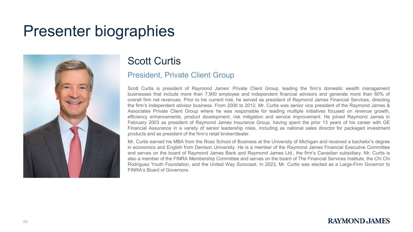 Scott Curtis Scott Curtis is president of Raymond James’ Private Client Group, leading the firm’s domestic wealth management businesses that include more than 7,900 employee and independent financial advisors and generate more than 60% of overall firm net revenues. Prior to his current role, he served as president of Raymond James Financial Services, directing the firm’s independent advisor business. From 2006 to 2012, Mr. Curtis was senior vice president of the Raymond James & Associates Private Client Group where he was responsible for leading multiple initiatives focused on revenue growth, efficiency enhancements, product development, risk mitigation and service improvement. He joined Raymond James in February 2003 as president of Raymond James Insurance Group, having spent the prior 13 years of his career with GE Financial Assurance in a variety of senior leadership roles, including as national sales director for packaged investment products and as president of the firm’s retail broker/dealer. Mr. Curtis earned his MBA from the Ross School of Business at the University of Michigan and received a bachelor’s degree in economics and English from Denison University. He is a member of the Raymond James Financial Executive Committee and serves on the board of Raymond James Bank and Raymond James Ltd., the firm’s Canadian subsidiary. Mr. Curtis is also a member of the FINRA Membership Committee and serves on the board of The Financial Services Institute, the Chi Chi Rodriguez Youth Foundation, and the United Way Suncoast. In 2023, Mr. Curtis was elected as a Large-Firm Governor to FINRA’s Board of Governors. President, Private Client Group Presenter biographies 88