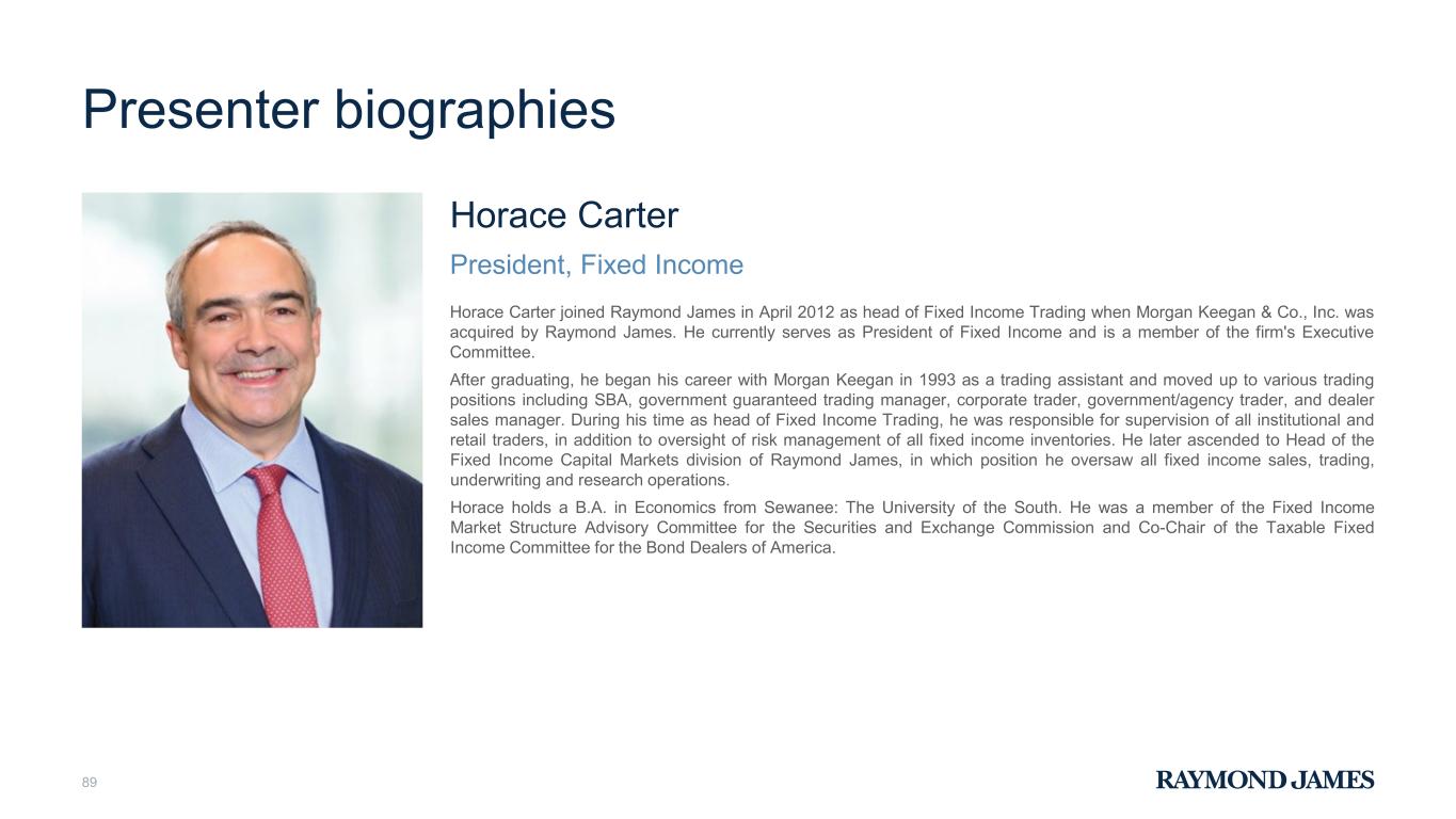 Horace Carter Horace Carter joined Raymond James in April 2012 as head of Fixed Income Trading when Morgan Keegan & Co., Inc. was acquired by Raymond James. He currently serves as President of Fixed Income and is a member of the firm's Executive Committee. After graduating, he began his career with Morgan Keegan in 1993 as a trading assistant and moved up to various trading positions including SBA, government guaranteed trading manager, corporate trader, government/agency trader, and dealer sales manager. During his time as head of Fixed Income Trading, he was responsible for supervision of all institutional and retail traders, in addition to oversight of risk management of all fixed income inventories. He later ascended to Head of the Fixed Income Capital Markets division of Raymond James, in which position he oversaw all fixed income sales, trading, underwriting and research operations. Horace holds a B.A. in Economics from Sewanee: The University of the South. He was a member of the Fixed Income Market Structure Advisory Committee for the Securities and Exchange Commission and Co-Chair of the Taxable Fixed Income Committee for the Bond Dealers of America. President, Fixed Income Presenter biographies 89