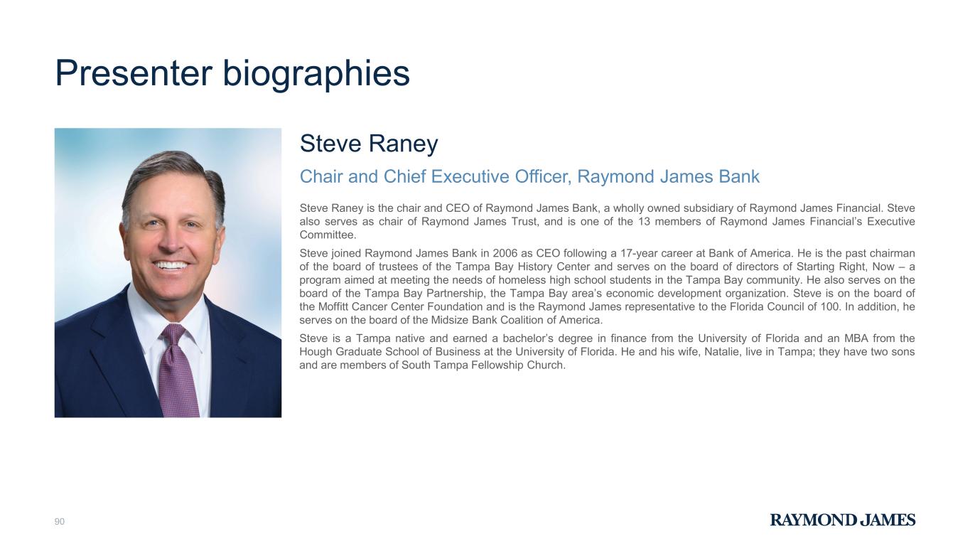 Steve Raney Steve Raney is the chair and CEO of Raymond James Bank, a wholly owned subsidiary of Raymond James Financial. Steve also serves as chair of Raymond James Trust, and is one of the 13 members of Raymond James Financial’s Executive Committee. Steve joined Raymond James Bank in 2006 as CEO following a 17-year career at Bank of America. He is the past chairman of the board of trustees of the Tampa Bay History Center and serves on the board of directors of Starting Right, Now ‒ a program aimed at meeting the needs of homeless high school students in the Tampa Bay community. He also serves on the board of the Tampa Bay Partnership, the Tampa Bay area’s economic development organization. Steve is on the board of the Moffitt Cancer Center Foundation and is the Raymond James representative to the Florida Council of 100. In addition, he serves on the board of the Midsize Bank Coalition of America. Steve is a Tampa native and earned a bachelor’s degree in finance from the University of Florida and an MBA from the Hough Graduate School of Business at the University of Florida. He and his wife, Natalie, live in Tampa; they have two sons and are members of South Tampa Fellowship Church. Chair and Chief Executive Officer, Raymond James Bank Presenter biographies 90