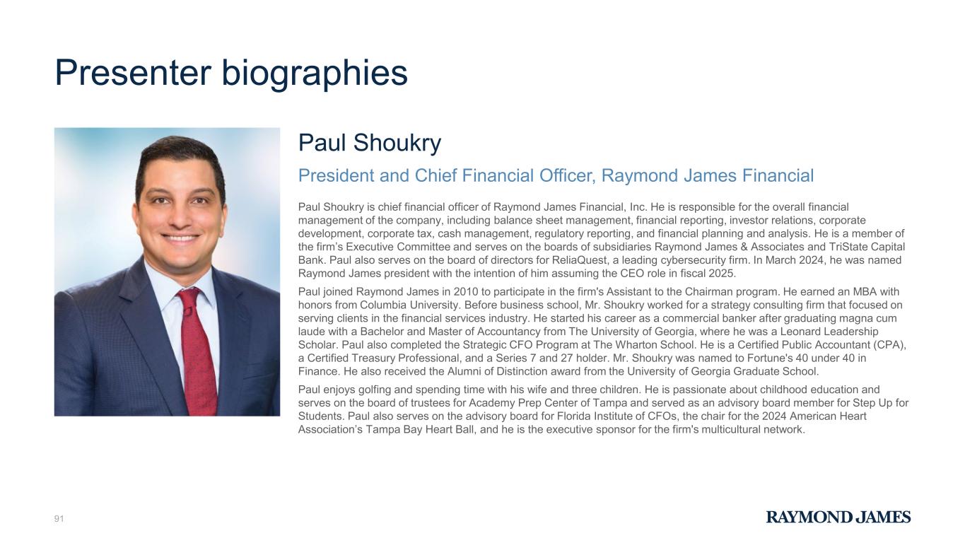 Paul Shoukry Paul Shoukry is chief financial officer of Raymond James Financial, Inc. He is responsible for the overall financial management of the company, including balance sheet management, financial reporting, investor relations, corporate development, corporate tax, cash management, regulatory reporting, and financial planning and analysis. He is a member of the firm’s Executive Committee and serves on the boards of subsidiaries Raymond James & Associates and TriState Capital Bank. Paul also serves on the board of directors for ReliaQuest, a leading cybersecurity firm. In March 2024, he was named Raymond James president with the intention of him assuming the CEO role in fiscal 2025. Paul joined Raymond James in 2010 to participate in the firm's Assistant to the Chairman program. He earned an MBA with honors from Columbia University. Before business school, Mr. Shoukry worked for a strategy consulting firm that focused on serving clients in the financial services industry. He started his career as a commercial banker after graduating magna cum laude with a Bachelor and Master of Accountancy from The University of Georgia, where he was a Leonard Leadership Scholar. Paul also completed the Strategic CFO Program at The Wharton School. He is a Certified Public Accountant (CPA), a Certified Treasury Professional, and a Series 7 and 27 holder. Mr. Shoukry was named to Fortune's 40 under 40 in Finance. He also received the Alumni of Distinction award from the University of Georgia Graduate School. Paul enjoys golfing and spending time with his wife and three children. He is passionate about childhood education and serves on the board of trustees for Academy Prep Center of Tampa and served as an advisory board member for Step Up for Students. Paul also serves on the advisory board for Florida Institute of CFOs, the chair for the 2024 American Heart Association’s Tampa Bay Heart Ball, and he is the executive sponsor for the firm's multicultural network. President and Chief Financial Officer, Raymond James Financial Presenter biographies 91