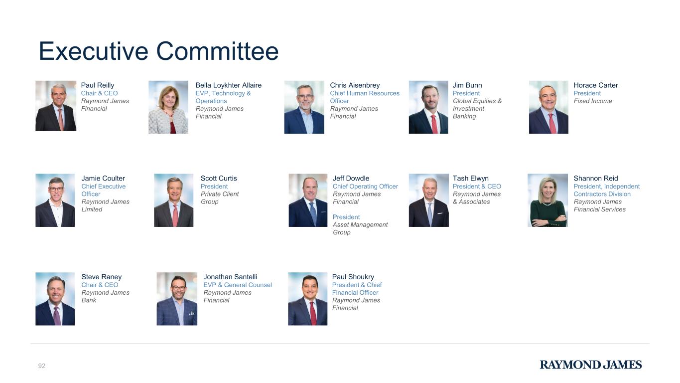 Jeff Dowdle Chief Operating Officer Raymond James Financial President Asset Management Group Executive Committee Paul Reilly Chair & CEO Raymond James Financial Bella Loykhter Allaire EVP, Technology & Operations Raymond James Financial Chris Aisenbrey Chief Human Resources Officer Raymond James Financial Jim Bunn President Global Equities & Investment Banking Horace Carter President Fixed Income Jamie Coulter Chief Executive Officer Raymond James Limited Tash Elwyn President & CEO Raymond James & Associates Shannon Reid President, Independent Contractors Division Raymond James Financial Services Scott Curtis President Private Client Group Steve Raney Chair & CEO Raymond James Bank Jonathan Santelli EVP & General Counsel Raymond James Financial Paul Shoukry President & Chief Financial Officer Raymond James Financial 92