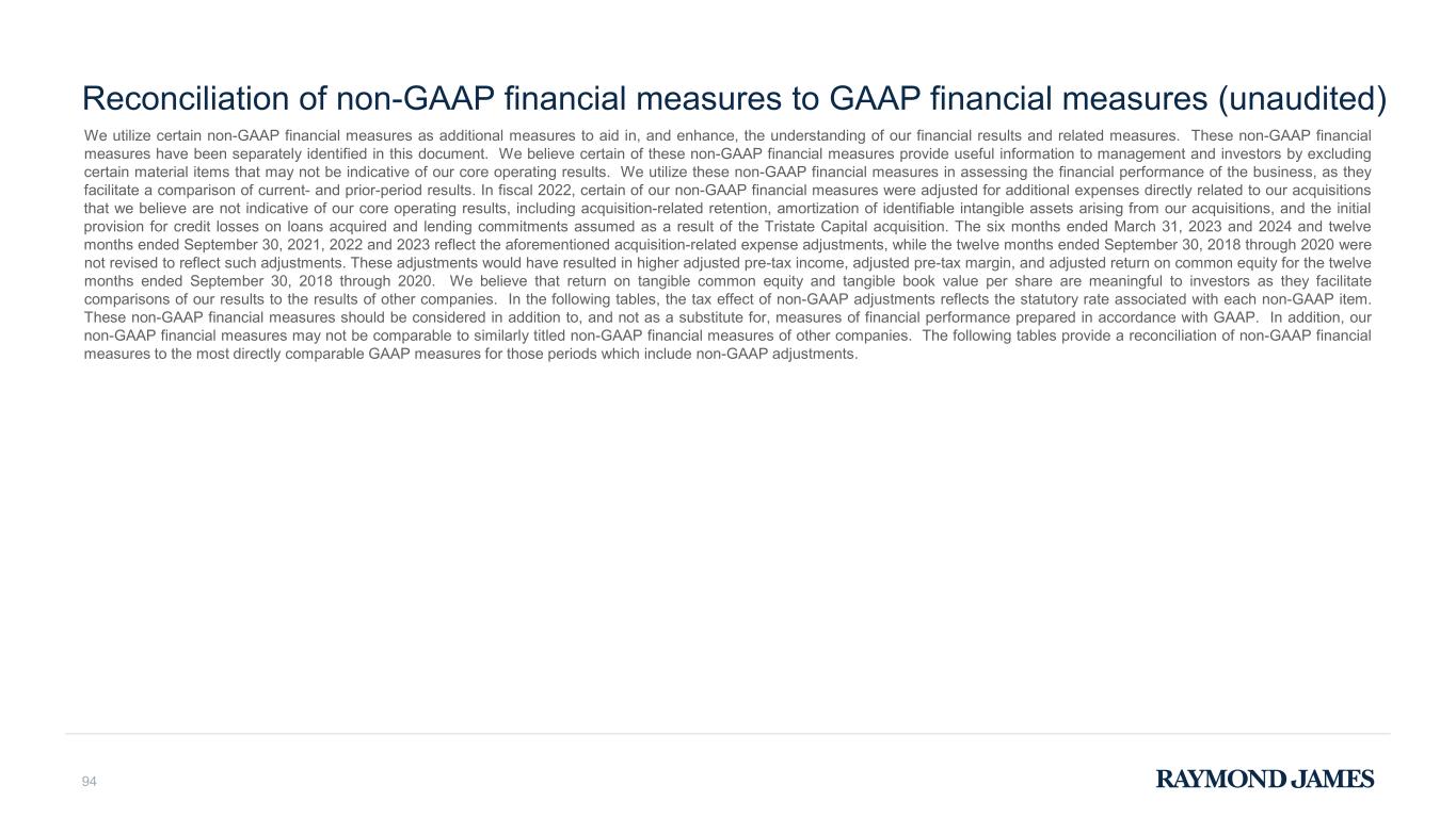 Reconciliation of non-GAAP financial measures to GAAP financial measures (unaudited) We utilize certain non-GAAP financial measures as additional measures to aid in, and enhance, the understanding of our financial results and related measures. These non-GAAP financial measures have been separately identified in this document. We believe certain of these non-GAAP financial measures provide useful information to management and investors by excluding certain material items that may not be indicative of our core operating results. We utilize these non-GAAP financial measures in assessing the financial performance of the business, as they facilitate a comparison of current- and prior-period results. In fiscal 2022, certain of our non-GAAP financial measures were adjusted for additional expenses directly related to our acquisitions that we believe are not indicative of our core operating results, including acquisition-related retention, amortization of identifiable intangible assets arising from our acquisitions, and the initial provision for credit losses on loans acquired and lending commitments assumed as a result of the Tristate Capital acquisition. The six months ended March 31, 2023 and 2024 and twelve months ended September 30, 2021, 2022 and 2023 reflect the aforementioned acquisition-related expense adjustments, while the twelve months ended September 30, 2018 through 2020 were not revised to reflect such adjustments. These adjustments would have resulted in higher adjusted pre-tax income, adjusted pre-tax margin, and adjusted return on common equity for the twelve months ended September 30, 2018 through 2020. We believe that return on tangible common equity and tangible book value per share are meaningful to investors as they facilitate comparisons of our results to the results of other companies. In the following tables, the tax effect of non-GAAP adjustments reflects the statutory rate associated with each non-GAAP item. These non-GAAP financial measures should be considered in addition to, and not as a substitute for, measures of financial performance prepared in accordance with GAAP. In addition, our non-GAAP financial measures may not be comparable to similarly titled non-GAAP financial measures of other companies. The following tables provide a reconciliation of non-GAAP financial measures to the most directly comparable GAAP measures for those periods which include non-GAAP adjustments. 94