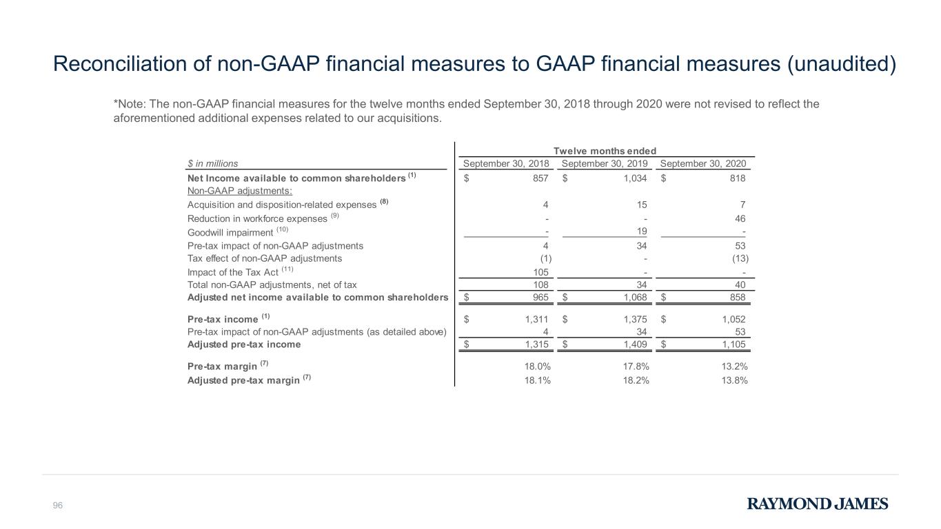 Reconciliation of non-GAAP financial measures to GAAP financial measures (unaudited) *Note: The non-GAAP financial measures for the twelve months ended September 30, 2018 through 2020 were not revised to reflect the aforementioned additional expenses related to our acquisitions. $ in millions September 30, 2018 September 30, 2019 September 30, 2020 Net Income available to common shareholders (1) 857$ 1,034$ 818$ Non-GAAP adjustments: Acquisition and disposition-related expenses (8) 4 15 7 Reduction in workforce expenses (9) - - 46 Goodwill impairment (10) - 19 - Pre-tax impact of non-GAAP adjustments 4 34 53 Tax effect of non-GAAP adjustments (1) - (13) Impact of the Tax Act (11) 105 - - Total non-GAAP adjustments, net of tax 108 34 40 Adjusted net income available to common shareholders 965$ 1,068$ 858$ Pre-tax income (1) 1,311$ 1,375$ 1,052$ Pre-tax impact of non-GAAP adjustments (as detailed above) 4 34 53 Adjusted pre-tax income 1,315$ 1,409$ 1,105$ Pre-tax margin (7) 18.0% 17.8% 13.2% Adjusted pre-tax margin (7) 18.1% 18.2% 13.8% Twelve months ended 96