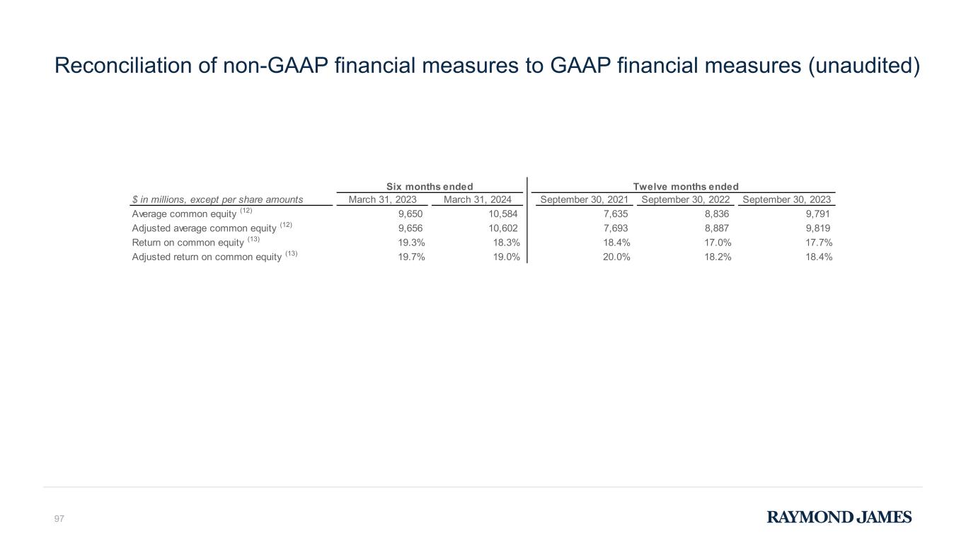 Reconciliation of non-GAAP financial measures to GAAP financial measures (unaudited) $ in millions, except per share amounts March 31, 2023 March 31, 2024 September 30, 2021 September 30, 2022 September 30, 2023 Average common equity (12) 9,650 10,584 7,635 8,836 9,791 Adjusted average common equity (12) 9,656 10,602 7,693 8,887 9,819 Return on common equity (13) 19.3% 18.3% 18.4% 17.0% 17.7% Adjusted return on common equity (13) 19.7% 19.0% 20.0% 18.2% 18.4% Six months ended Twelve months ended 97