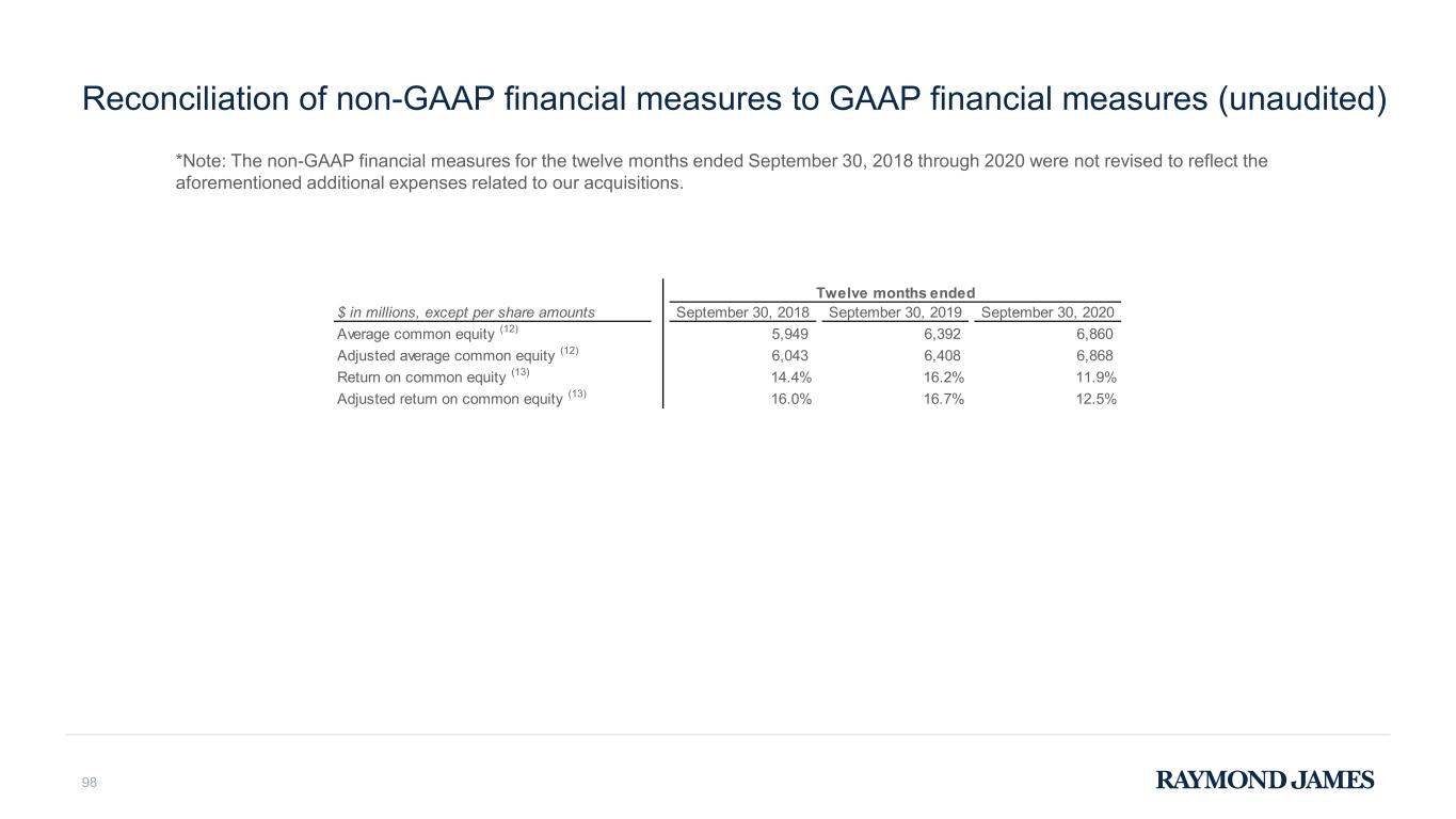 Reconciliation of non-GAAP financial measures to GAAP financial measures (unaudited) *Note: The non-GAAP financial measures for the twelve months ended September 30, 2018 through 2020 were not revised to reflect the aforementioned additional expenses related to our acquisitions. $ in millions, except per share amounts September 30, 2018 September 30, 2019 September 30, 2020 Average common equity (12) 5,949 6,392 6,860 Adjusted average common equity (12) 6,043 6,408 6,868 Return on common equity (13) 14.4% 16.2% 11.9% Adjusted return on common equity (13) 16.0% 16.7% 12.5% Twelve months ended 98