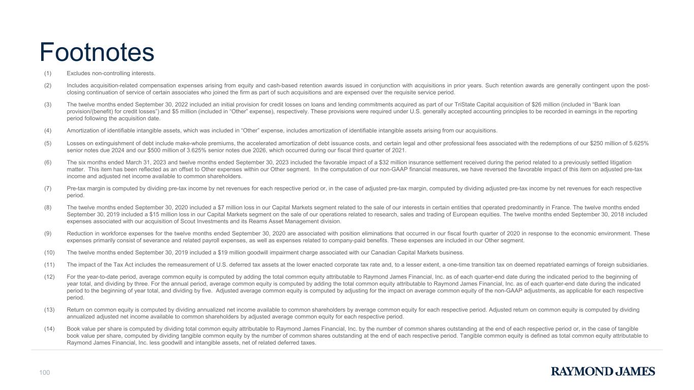 Footnotes (1) Excludes non-controlling interests. (2) Includes acquisition-related compensation expenses arising from equity and cash-based retention awards issued in conjunction with acquisitions in prior years. Such retention awards are generally contingent upon the post- closing continuation of service of certain associates who joined the firm as part of such acquisitions and are expensed over the requisite service period. (3) The twelve months ended September 30, 2022 included an initial provision for credit losses on loans and lending commitments acquired as part of our TriState Capital acquisition of $26 million (included in “Bank loan provision/(benefit) for credit losses”) and $5 million (included in “Other” expense), respectively. These provisions were required under U.S. generally accepted accounting principles to be recorded in earnings in the reporting period following the acquisition date. (4) Amortization of identifiable intangible assets, which was included in “Other” expense, includes amortization of identifiable intangible assets arising from our acquisitions. (5) Losses on extinguishment of debt include make-whole premiums, the accelerated amortization of debt issuance costs, and certain legal and other professional fees associated with the redemptions of our $250 million of 5.625% senior notes due 2024 and our $500 million of 3.625% senior notes due 2026, which occurred during our fiscal third quarter of 2021. (6) The six months ended March 31, 2023 and twelve months ended September 30, 2023 included the favorable impact of a $32 million insurance settlement received during the period related to a previously settled litigation matter. This item has been reflected as an offset to Other expenses within our Other segment. In the computation of our non-GAAP financial measures, we have reversed the favorable impact of this item on adjusted pre-tax income and adjusted net income available to common shareholders. (7) Pre-tax margin is computed by dividing pre-tax income by net revenues for each respective period or, in the case of adjusted pre-tax margin, computed by dividing adjusted pre-tax income by net revenues for each respective period. (8) The twelve months ended September 30, 2020 included a $7 million loss in our Capital Markets segment related to the sale of our interests in certain entities that operated predominantly in France. The twelve months ended September 30, 2019 included a $15 million loss in our Capital Markets segment on the sale of our operations related to research, sales and trading of European equities. The twelve months ended September 30, 2018 included expenses associated with our acquisition of Scout Investments and its Reams Asset Management division. (9) Reduction in workforce expenses for the twelve months ended September 30, 2020 are associated with position eliminations that occurred in our fiscal fourth quarter of 2020 in response to the economic environment. These expenses primarily consist of severance and related payroll expenses, as well as expenses related to company-paid benefits. These expenses are included in our Other segment. (10) The twelve months ended September 30, 2019 included a $19 million goodwill impairment charge associated with our Canadian Capital Markets business. (11) The impact of the Tax Act includes the remeasurement of U.S. deferred tax assets at the lower enacted corporate tax rate and, to a lesser extent, a one-time transition tax on deemed repatriated earnings of foreign subsidiaries. (12) For the year-to-date period, average common equity is computed by adding the total common equity attributable to Raymond James Financial, Inc. as of each quarter-end date during the indicated period to the beginning of year total, and dividing by three. For the annual period, average common equity is computed by adding the total common equity attributable to Raymond James Financial, Inc. as of each quarter-end date during the indicated period to the beginning of year total, and dividing by five. Adjusted average common equity is computed by adjusting for the impact on average common equity of the non-GAAP adjustments, as applicable for each respective period. (13) Return on common equity is computed by dividing annualized net income available to common shareholders by average common equity for each respective period. Adjusted return on common equity is computed by dividing annualized adjusted net income available to common shareholders by adjusted average common equity for each respective period. (14) Book value per share is computed by dividing total common equity attributable to Raymond James Financial, Inc. by the number of common shares outstanding at the end of each respective period or, in the case of tangible book value per share, computed by dividing tangible common equity by the number of common shares outstanding at the end of each respective period. Tangible common equity is defined as total common equity attributable to Raymond James Financial, Inc. less goodwill and intangible assets, net of related deferred taxes. 100