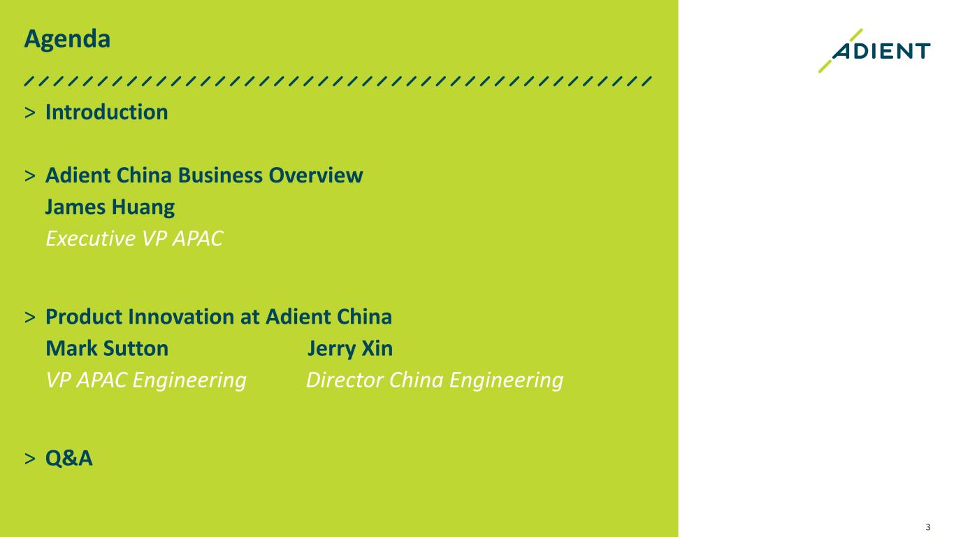3 Agenda > Introduction > Adient China Business Overview James Huang Executive VP APAC > Product Innovation at Adient China Mark Sutton Jerry Xin VP APAC Engineering Director China Engineering > Q&A