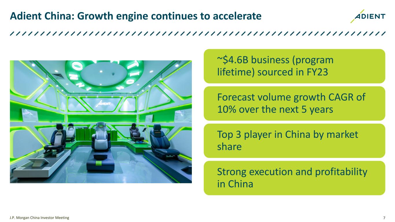 6 Adient China: Business overview J.P. Morgan China Investor Meeting We generated $4B+ sales revenue in FY2023 1 We have 2 wholly-owned entities with 12 plants 7 joint ventures We have 36 manufacturing locations 3 global tech centers (Adient Chongqing, CFAA & Keiper) in cities22 with ~18% combined share 2 of the passenger vehicle market We employ ~21,000 highly engaged employees including ~1000 engineers Note: 1 - Includes consolidated and unconsolidated sales 2 - Market share is based on mgmt. estimates