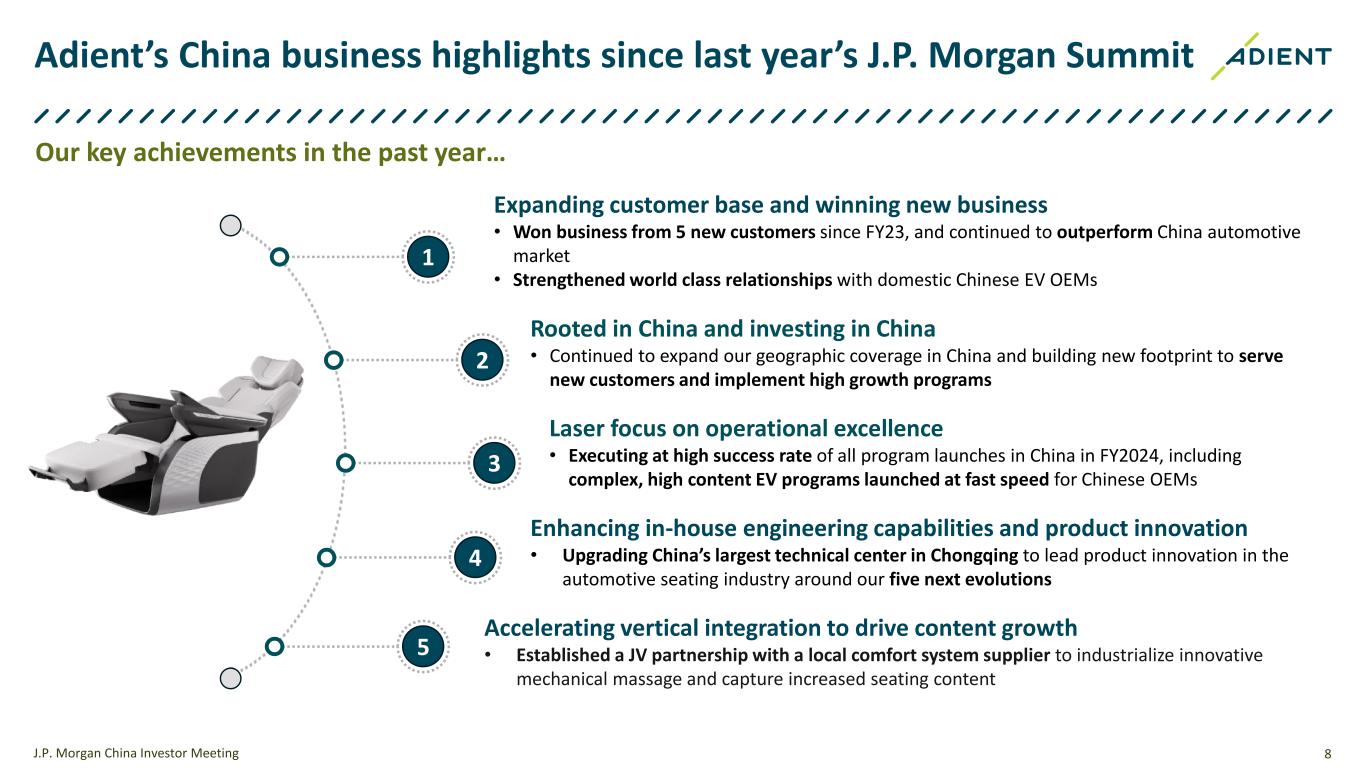 7 Adient China: Growth engine continues to accelerate ~$4.6B business (program lifetime) sourced in FY23 Forecast volume growth CAGR of 10% over the next 5 years Top 3 player in China by market share Strong execution and profitability in China J.P. Morgan China Investor Meeting
