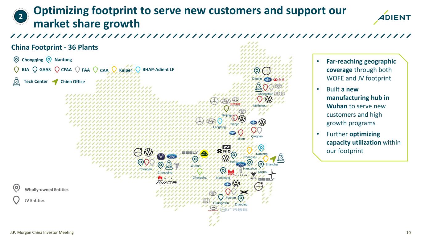 9 Adient China have captured 5 new customers since FY2023 J.P. Morgan China Investor Meeting Adient China Customer Mix 1 60% 40% • Continued to win vertically integrated new business within our strategic customer base in China, identify and target programs and customers as market dynamics shift 40% 60% 2023 2028 Chinese OEM International OEM 1 - Management estimates, including consolidated and unconsolidated revenues 1