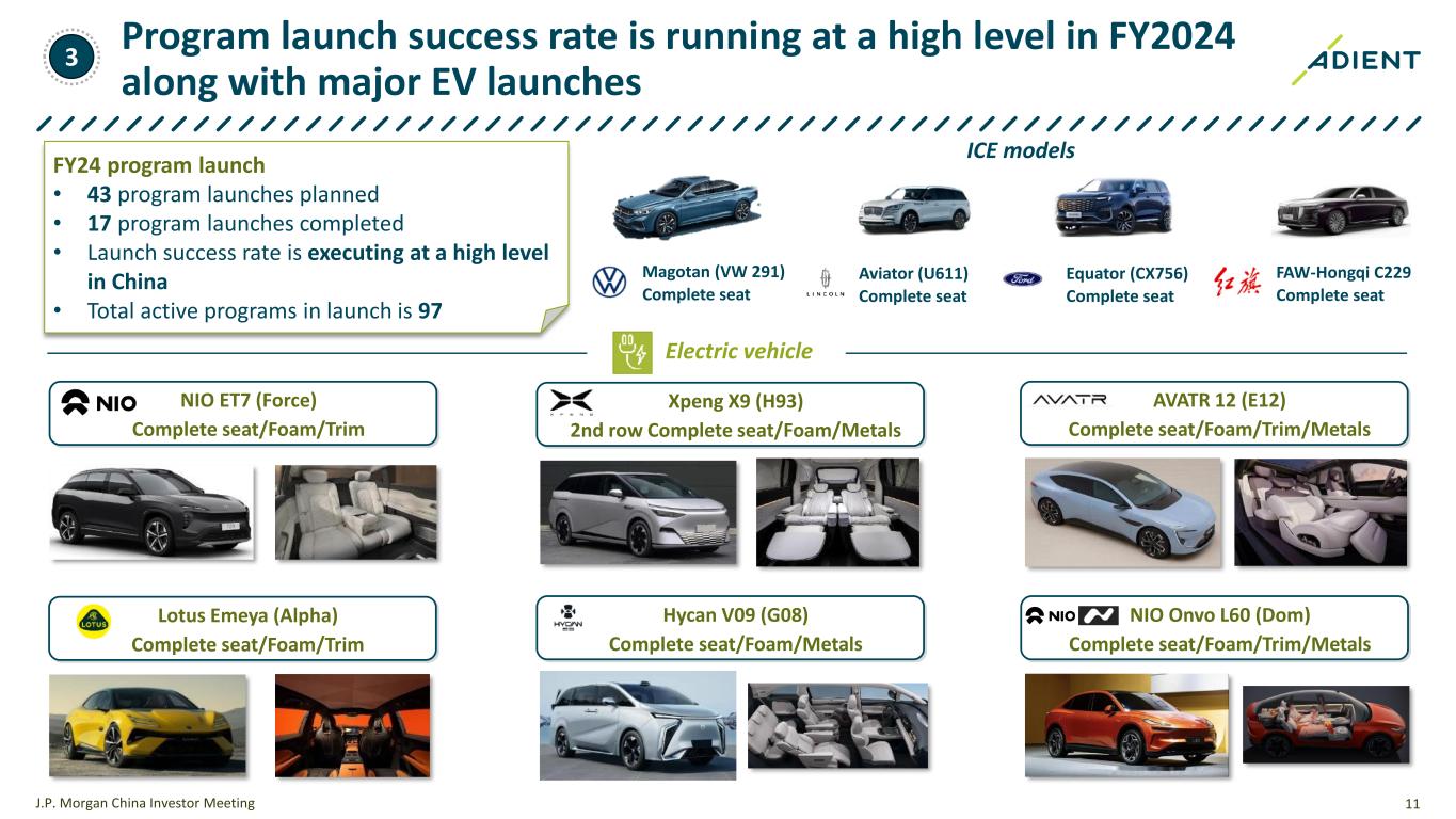 10J.P. Morgan China Investor Meeting • Far-reaching geographic coverage through both WOFE and JV footprint • Built a new manufacturing hub in Wuhan to serve new customers and high growth programs • Further optimizing capacity utilization within our footprint Changchun Guangzhou Foshan Changsha Nanchang Chongqing Chengdu Taizhou Tianjin Daqing Qingdao Langfang Nantong Wuhan Hefei Zhaoqing Hangzhou Beijing Meihekou Jinan Shanghai Changshu Wholly-owned Entities JV Entities China Footprint - 36 Plants Chongqing BJA CFAAGAAS BHAP-Adient LF Nantong FAA CAA Keiper Tech Center China Office Optimizing footprint to serve new customers and support our market share growth 2