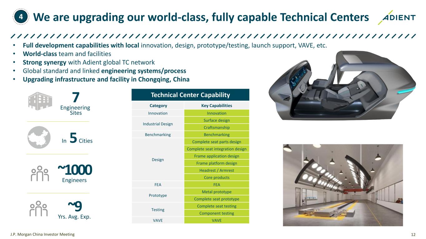 Hycan V09 (G08) Complete seat/Foam/Metals Program launch success rate is running at a high level in FY2024 along with major EV launches 11 FY24 program launch • 43 program launches planned • 17 program launches completed • Launch success rate is executing at a high level in China • Total active programs in launch is 97 J.P. Morgan China Investor Meeting Electric vehicle Xpeng X9 (H93) 2nd row Complete seat/Foam/Metals AVATR 12 (E12) Complete seat/Foam/Trim/Metals NIO ET7 (Force) Complete seat/Foam/Trim Magotan (VW 291) Complete seat FAW-Hongqi C229 Complete seat Aviator (U611) Complete seat Equator (CX756) Complete seat ICE models 3 Lotus Emeya (Alpha) Complete seat/Foam/Trim NIO Onvo L60 (Dom) Complete seat/Foam/Trim/Metals