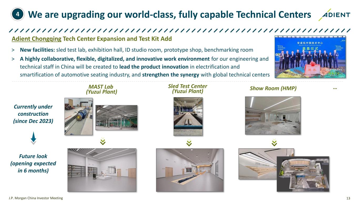 12J.P. Morgan China Investor Meeting Technical Center Capability Category Key Capabilities Innovation Innovation Industrial Design Surface design Craftsmanship Benchmarking Benchmarking Design Complete seat parts design Complete seat integration design Frame application design Frame platform design Headrest / Armrest Core products FEA FEA Prototype Metal prototype Complete seat prototype Testing Complete seat testing Component testing VAVE VAVE In 5 Cities 7 Engineering Sites ~1000 Engineers • Full development capabilities with local innovation, design, prototype/testing, launch support, VAVE, etc. • World-class team and facilities • Strong synergy with Adient global TC network • Global standard and linked engineering systems/process • Upgrading infrastructure and facility in Chongqing, China We are upgrading our world-class, fully capable Technical Centers ~9 Yrs. Avg. Exp. 4